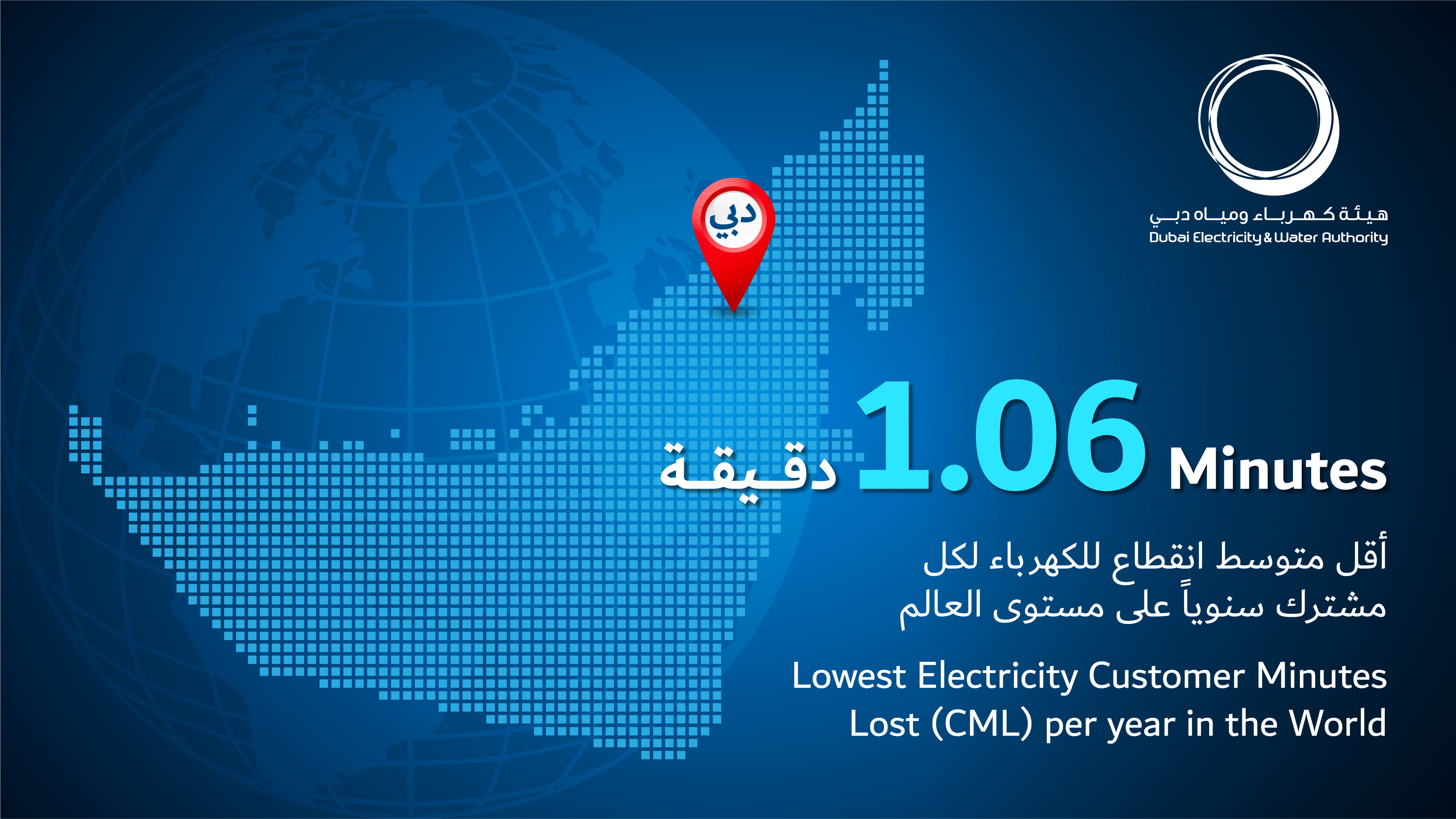 - DEWA records the world’s lowest electricity Customer Minutes Lost (CML) per year in the world with an average of 1.06 minutes
