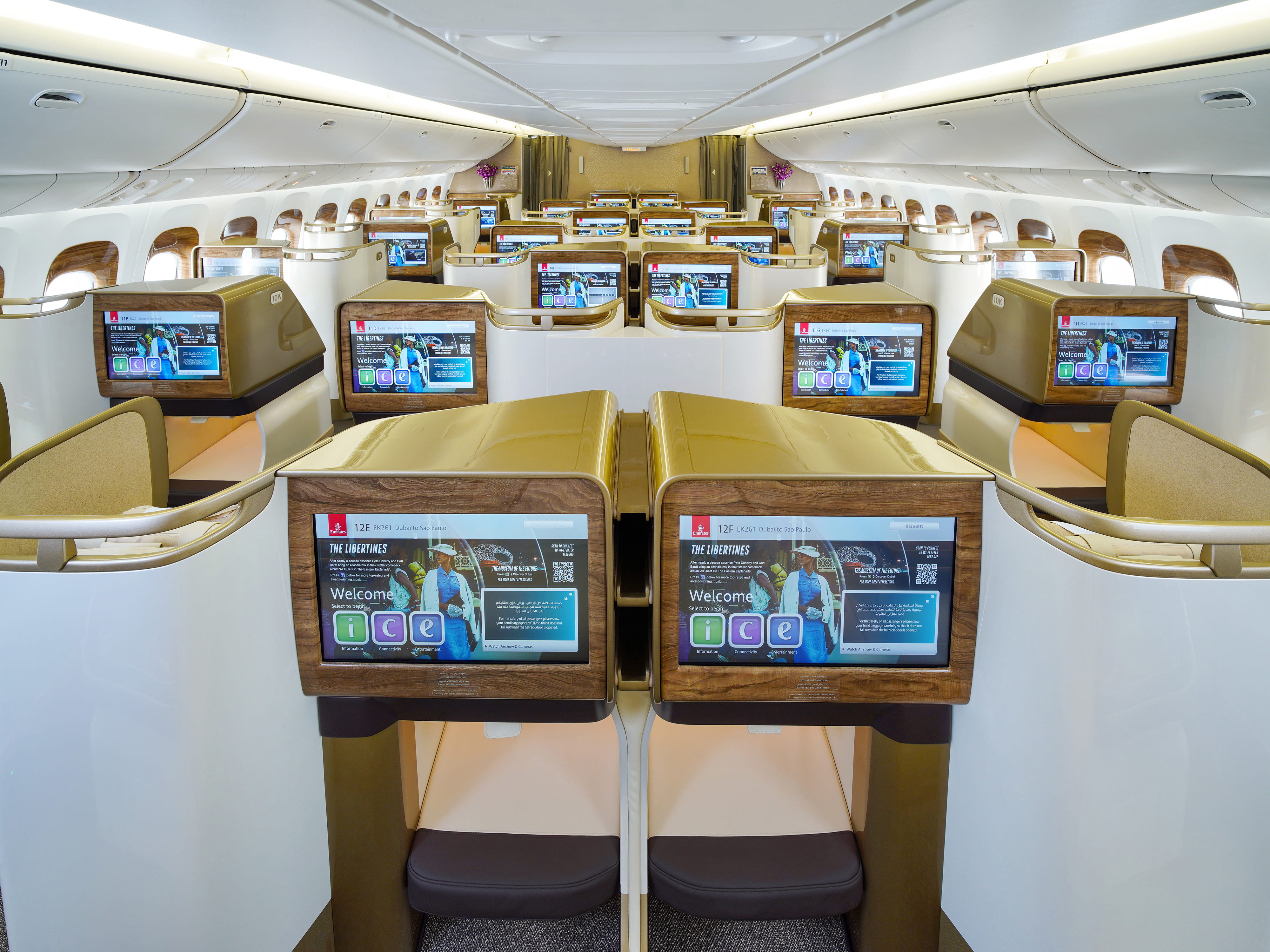 The new Emirates 777 Business Class is set in a warm and inviting cabin featuring thoughtful refinements with enhanced privacy for customers. The cabin’s seats and colour story have been enhanced to echo the light and airy design elements of Emirates' iconic A380 experience, with soft leather cream seats accented with champagne trim, lighter wood panelling, and modern technology touches that deliver function and luxury.