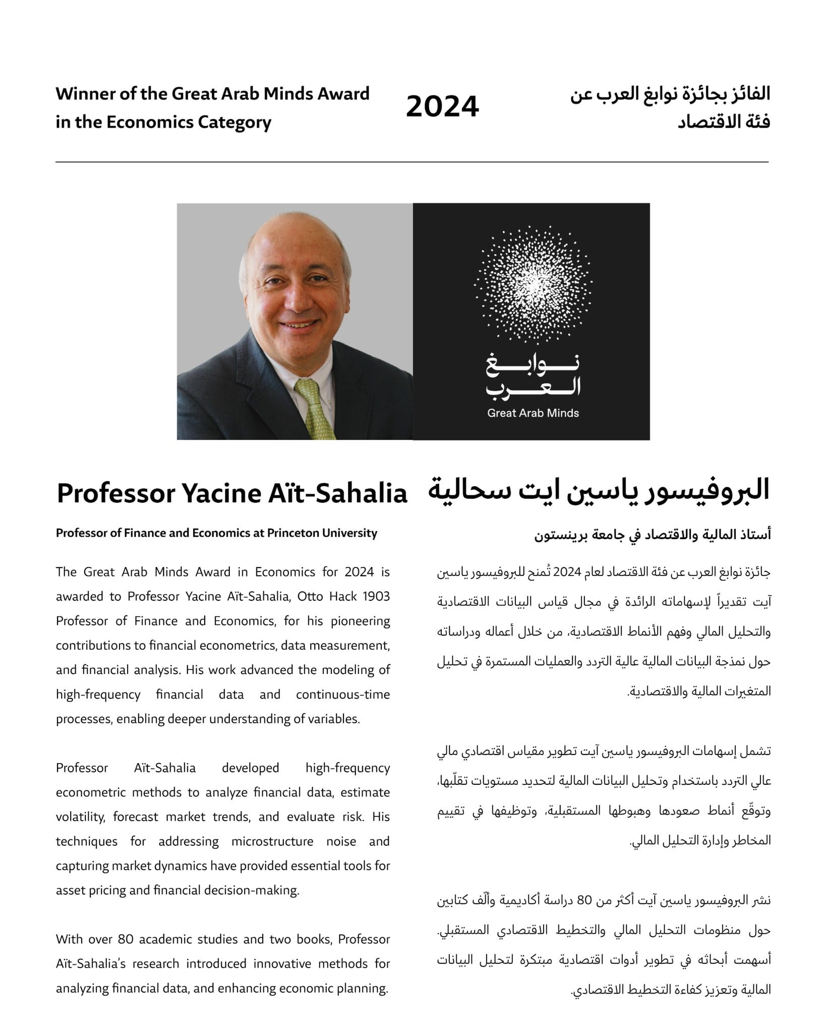 His Highness Sheikh Mohammed said, "We congratulate the winner of the Great Arab Minds Award in Economics for 2024, Professor Yacine Aït-Sahalia from Algeria, Professor of Finance and Economics at Princeton University, who has made exceptional contributions by developing an advanced economic and financial metric to determine volatility levels and understand future patterns of market fluctuations. His work has enhanced financial market analysis, improved economic risk assessments, and increased the efficiency of financial and economic planning.
