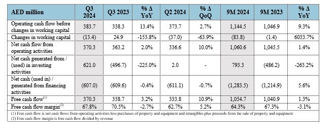 Salik generated free cash flow of AED 1,054.7 million in the nine-month period, up 1.3% YoY, with a free cash flow margin of 64.3%. Free cash flow reached AED 370.3 million in the third quarter, up 3.2% year-on-year, with a free cash flow margin of 67.8%. The free cash flow margin declined by c.310basis points versus the prior year in the nine-month period, and c.270 basis points versus Q3 2023, primarily due to an increase in intangible assets related to the parking management solution.