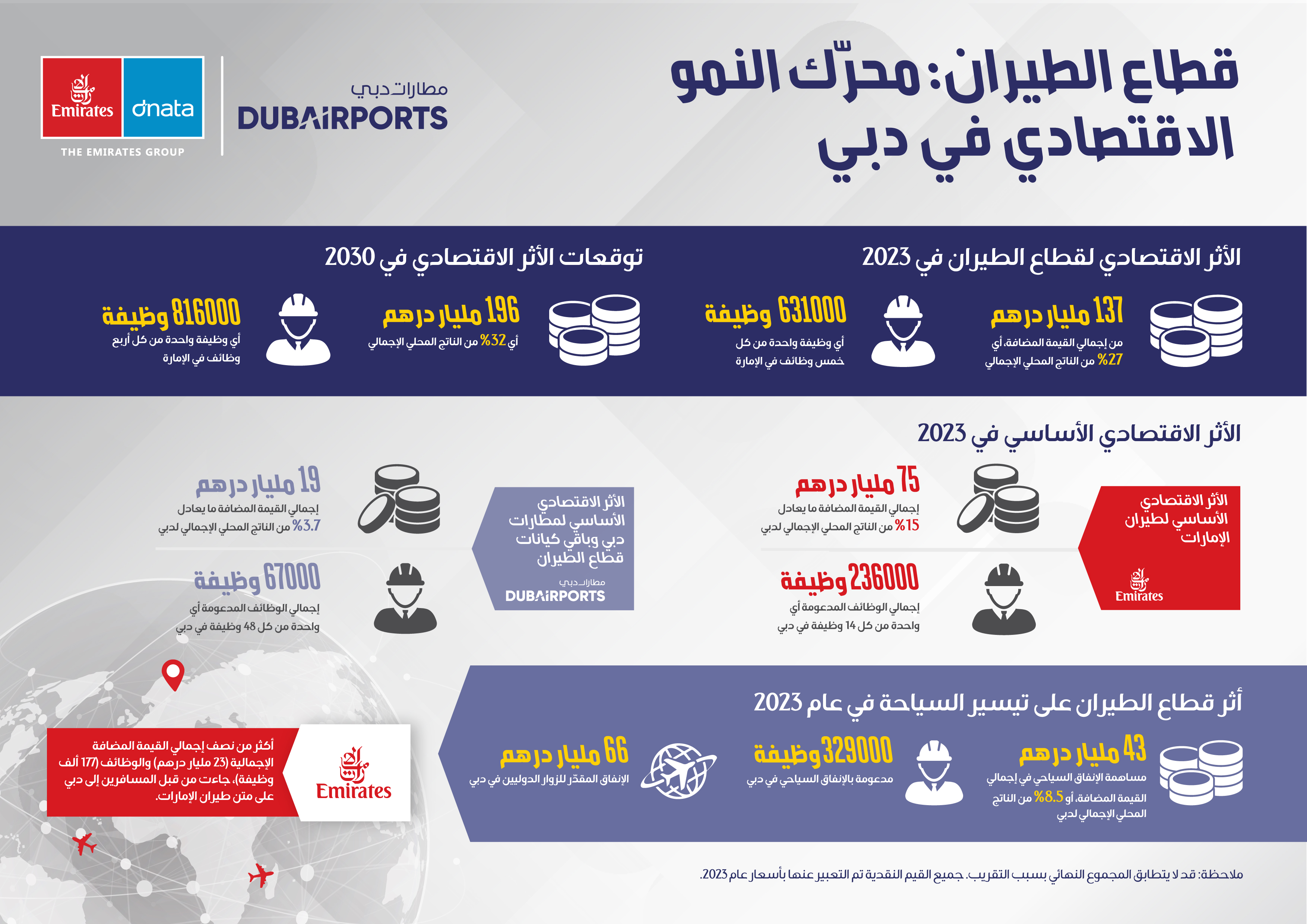 In 2023, Dubai’s aviation sector, consisting of Emirates Group, Dubai Airports (including Dubai International and Dubai World Central - Al Maktoum airports), and other aviation sector entities¹ are estimated to have supported AED 137 billion (USD 37.3 billion) in gross value added² (GVA), equivalent to 27% of Dubai’s GDP. This included the core economic impact of AED 94 billion, and AED 43 billion from the catalytic impact of aviation-facilitated tourism. These figures are projected to increase steadily, with aviation activities facilitated by Emirates and Dubai Airports contributing AED 196 billion, or 32% of Dubai’s forecasted GDP by 2030 (in 2023 prices).