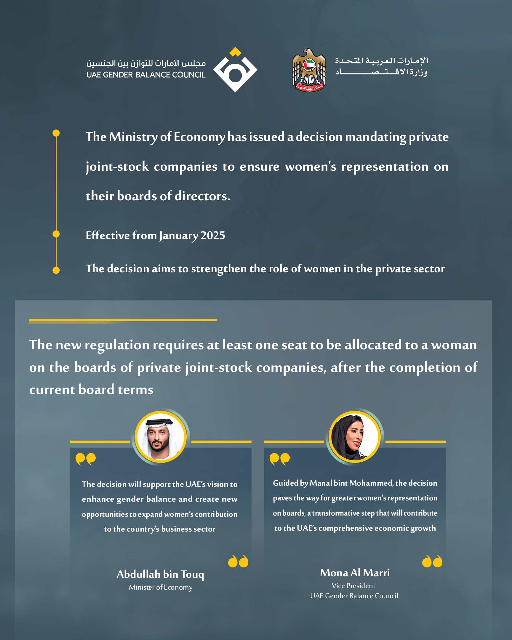 In 2021, the Board of the UAE Securities and Commodities Authority (SCA) issued a landmark decision that mandated public joint stock companies listed in Abu Dhabi and Dubai stock markets to have at least one woman board member. The latest decision of the Ministry of Economy to extend the requirement to private joint-stock companies further supports the UAE’s vision to empower women and encourage them to play a greater role on the boards of listed companies.