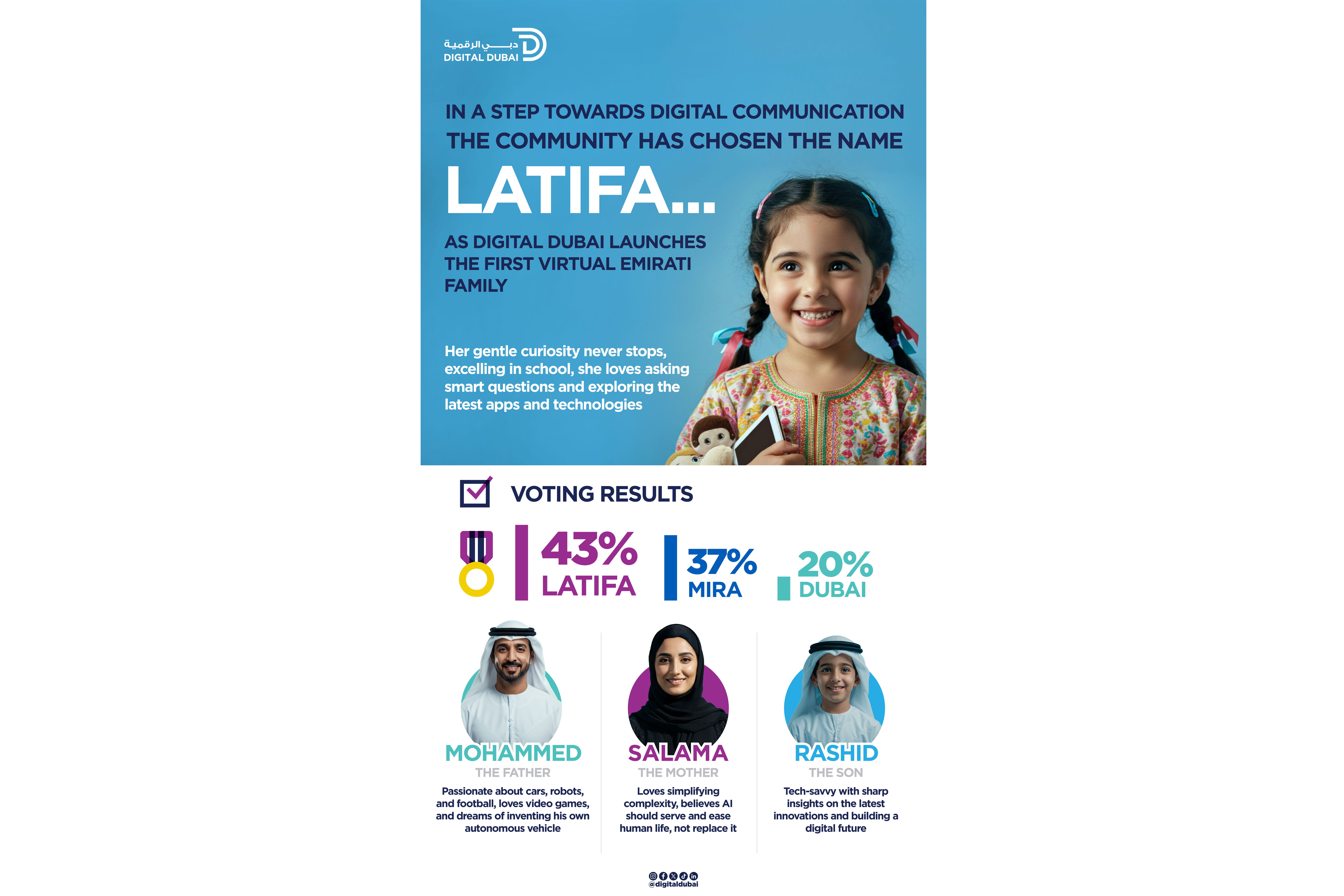 In the next phase, Digital Dubai will focus on developing integrated communication identities for the virtual family members, delivering a series of storytelling and awareness content targeting different age groups and community segments. These efforts aim to make digital services more accessible through entertaining and educational formats. Latifa and her family will soon appear across social media platforms to highlight Digital Dubai’s initiatives and promote safe, responsible behavior in the digital space.