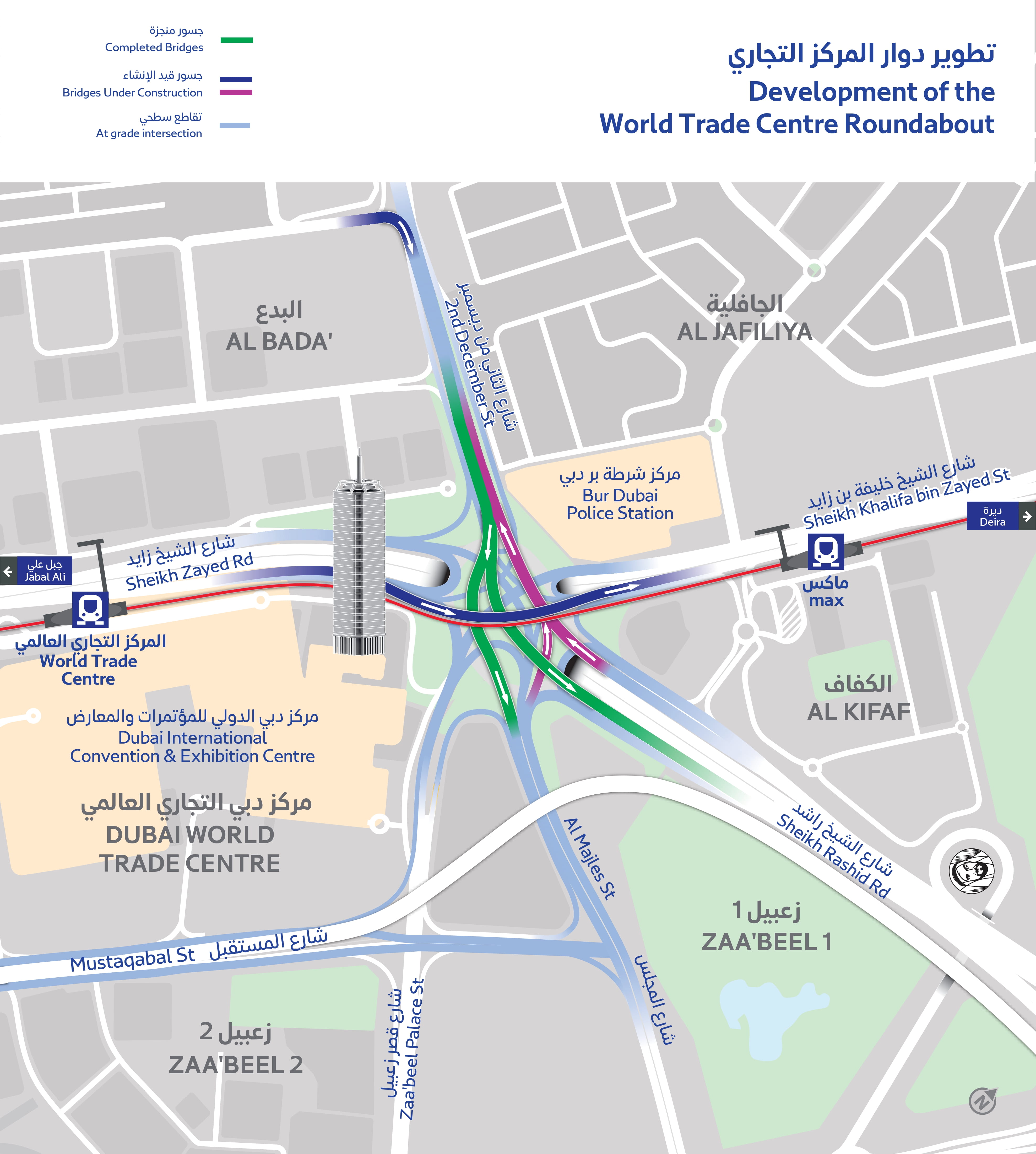 His Excellency Mattar Al Tayer, Director General, Chairman of the Board of Executive Directors of the Roads and Transport Authority, said: “Trade Centre Roundabout is one of the major intersections in Dubai, linking Sheikh Zayed Road with five vital streets: Sheikh Khalifa bin Zayed Street, Sheikh Rashid Road, 2nd December Street, Zabeel Palace Street, and Al Majlis Street.”