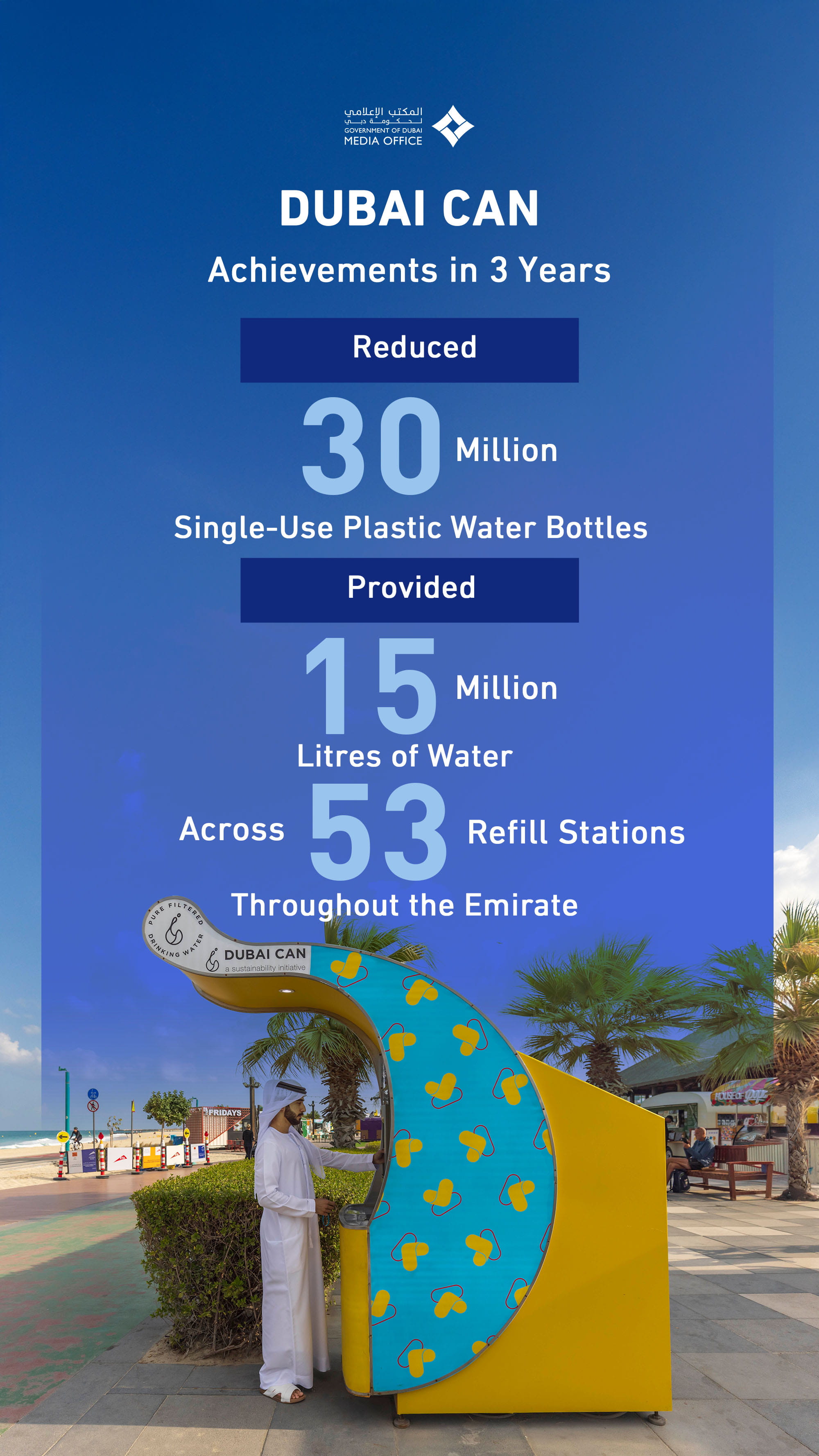 Launched on 15 February 2022 by His Highness Sheikh Hamdan bin Mohammed bin Rashid Al Maktoum, Crown Prince of Dubai, Deputy Prime Minister, Minister of Defence, and Chairman of The Executive Council of Dubai, the Dubai Can initiative has reshaped how both residents and visitors stay hydrated in an eco-friendly way, fostering awareness of plastic alternatives and sustainability through its core projects, Refill for Life and DUBAI REEF.
