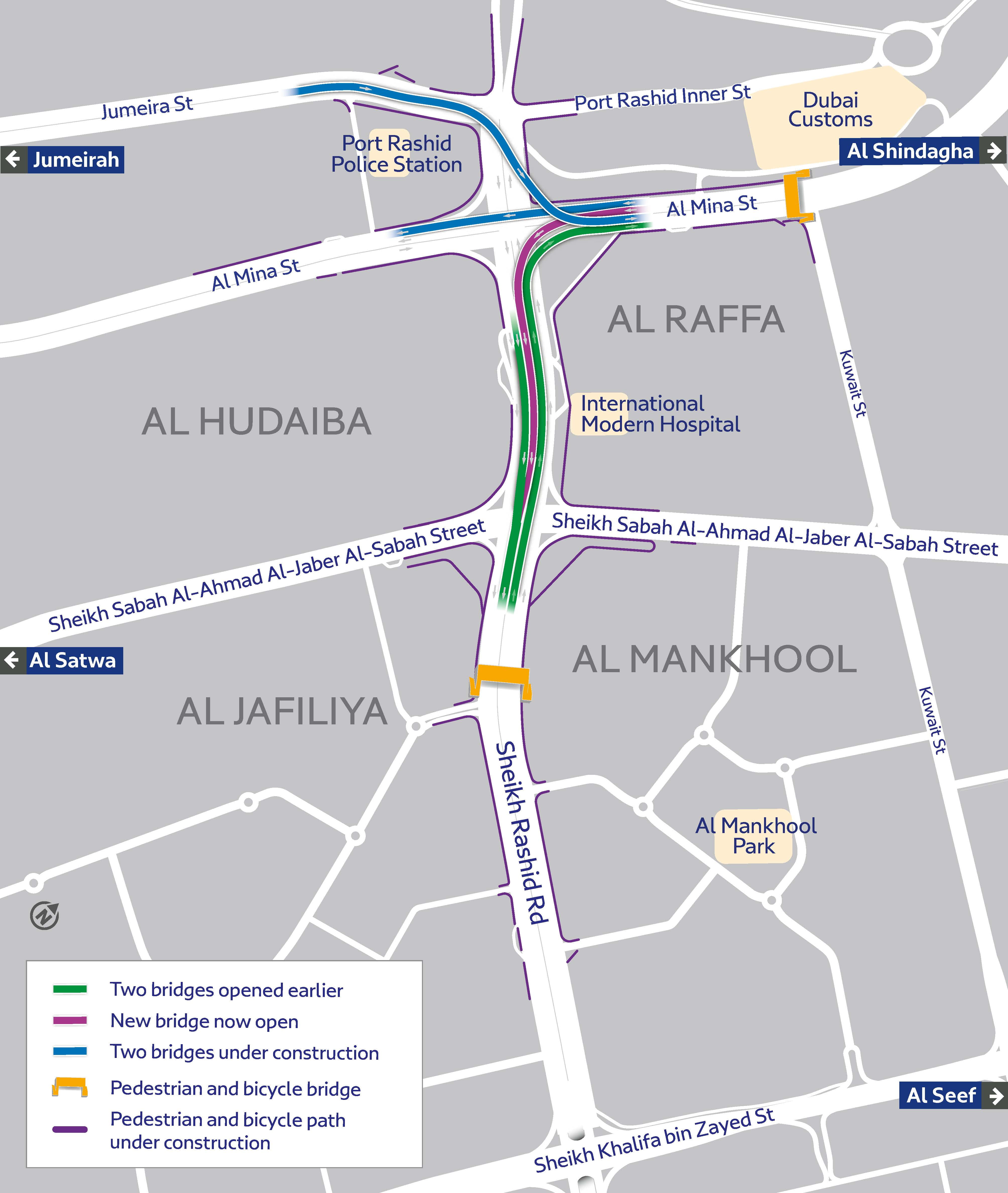 In December, RTA opened a 1,335-metre bridge featuring three lanes and a capacity of 4,800 vehicles per hour. The bridge facilitates traffic movement from the intersection of Sheikh Khalifa bin Zayed Street with Sheikh Rashid Road towards Al Mina Street and Falcon intersection, extending to Infinity Bridge. Its opening has significantly improved traffic flow from Sheikh Rashid Road to Infinity Bridge and onward to Deira.