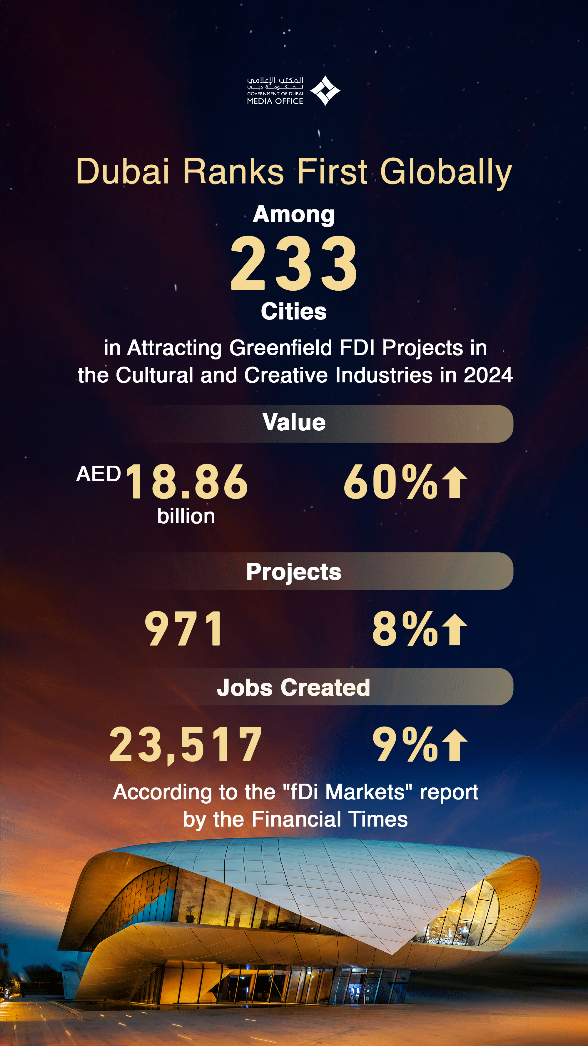 Dubai retained its position as the top global destination for attracting Greenfield FDI projects in cultural and creative industries among 233 cities in the report for the third year in a row, surpassing major cities such as London and Singapore. This achievement was driven by the emirate’s strong performance across sub-sectors within the broader cultural and creative industries ecosystem. In 2024, Dubai attracted 971 projects in the sector, with total FDI capital inflows reaching AED18.86 billion, resulting in the creation of 23,517 new jobs.