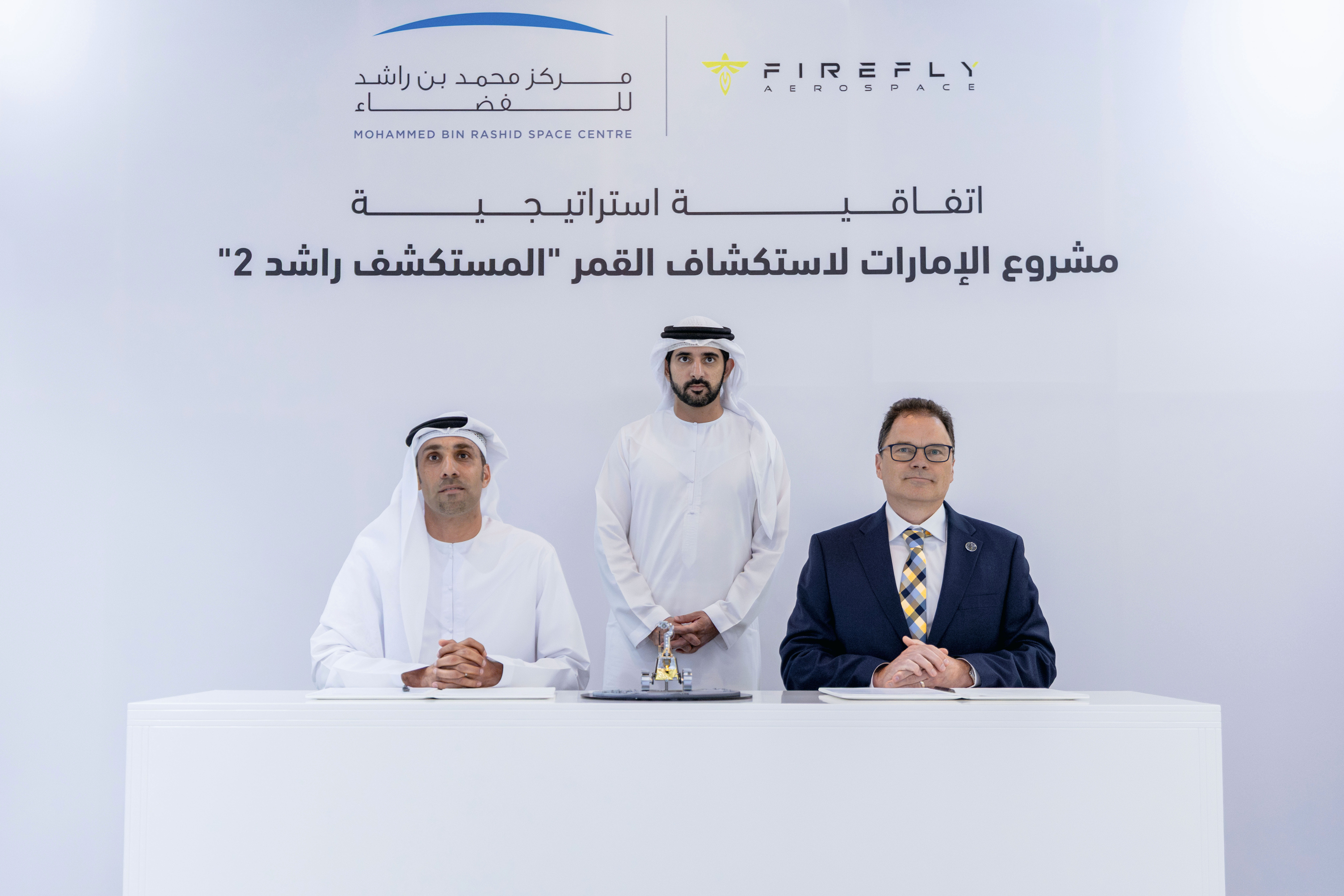 His Highness Sheikh Hamdan bin Mohammed bin Rashid Al Maktoum, Crown Prince of Dubai, Deputy Prime Minister and Minister of Defence of the UAE, and President of MBRSC, witnessed the signing of a strategic agreement between the Mohammed Bin Rashid Space Centre (MBRSC) and Firefly Aerospace, under which the latter will provide the lunar lander to deploy the Rashid 2 Rover under the Emirates Lunar Mission to the far side of the moon. The signing was held at Emirates Towers.