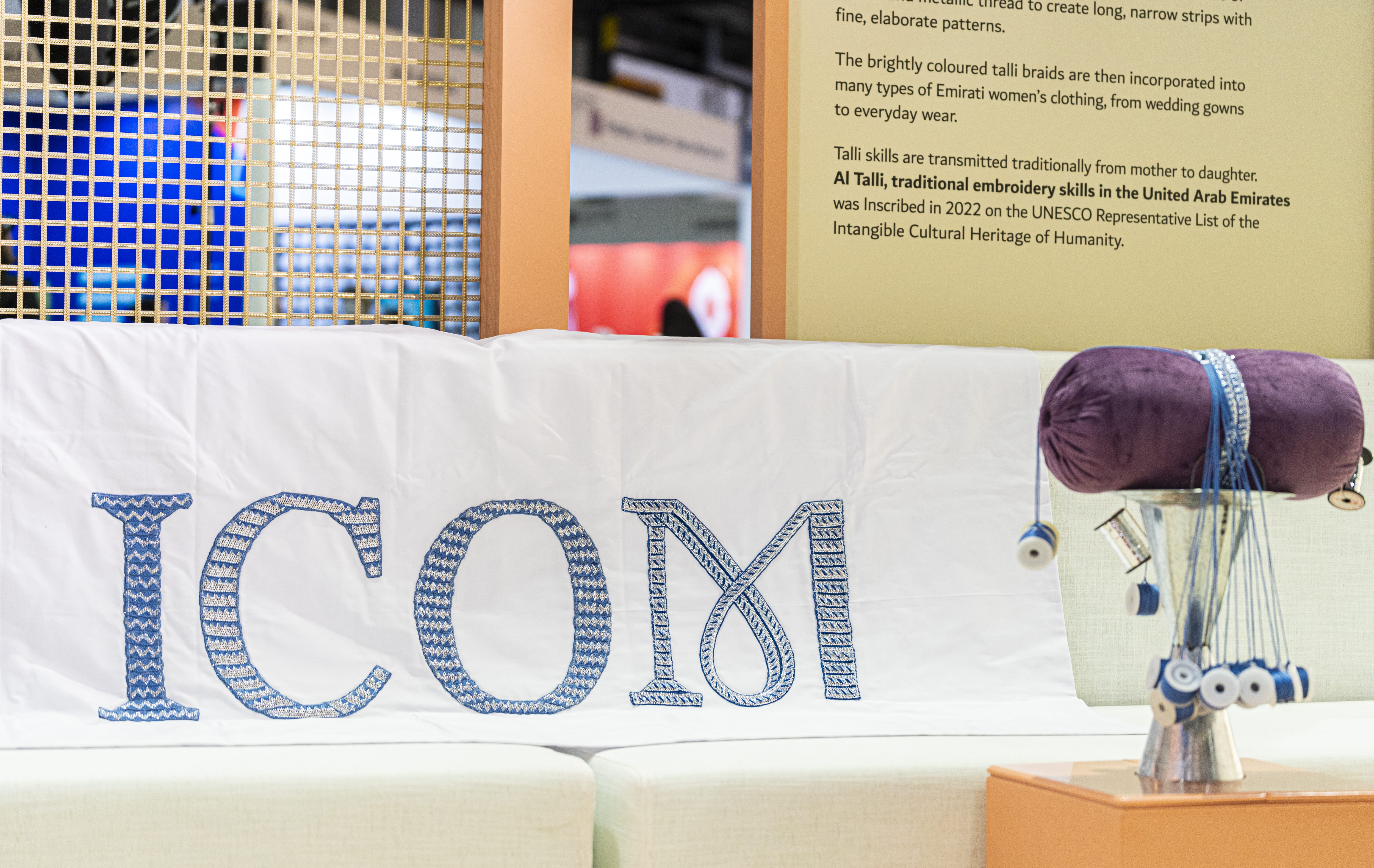The design highlights the ICOM logo in two shades of blue, woven using four traditional Talli stitches: Fanikh Al Batikh, Alberwi (or Almeshara), Alfin, and Alkouli. Showcasing the artisans’ skill and the richness of the UAE’s culture and heritage, these stitches help powerfully convey the conference theme, ‘The Future of Museums in Rapidly Changing Communities.’ Through the harmony of these patterns, the artwork expresses unity in diversity. The exquisite craftwork highlights the role of culture as a bridge between peoples, a platform for future foresight, and a celebration of creativity.