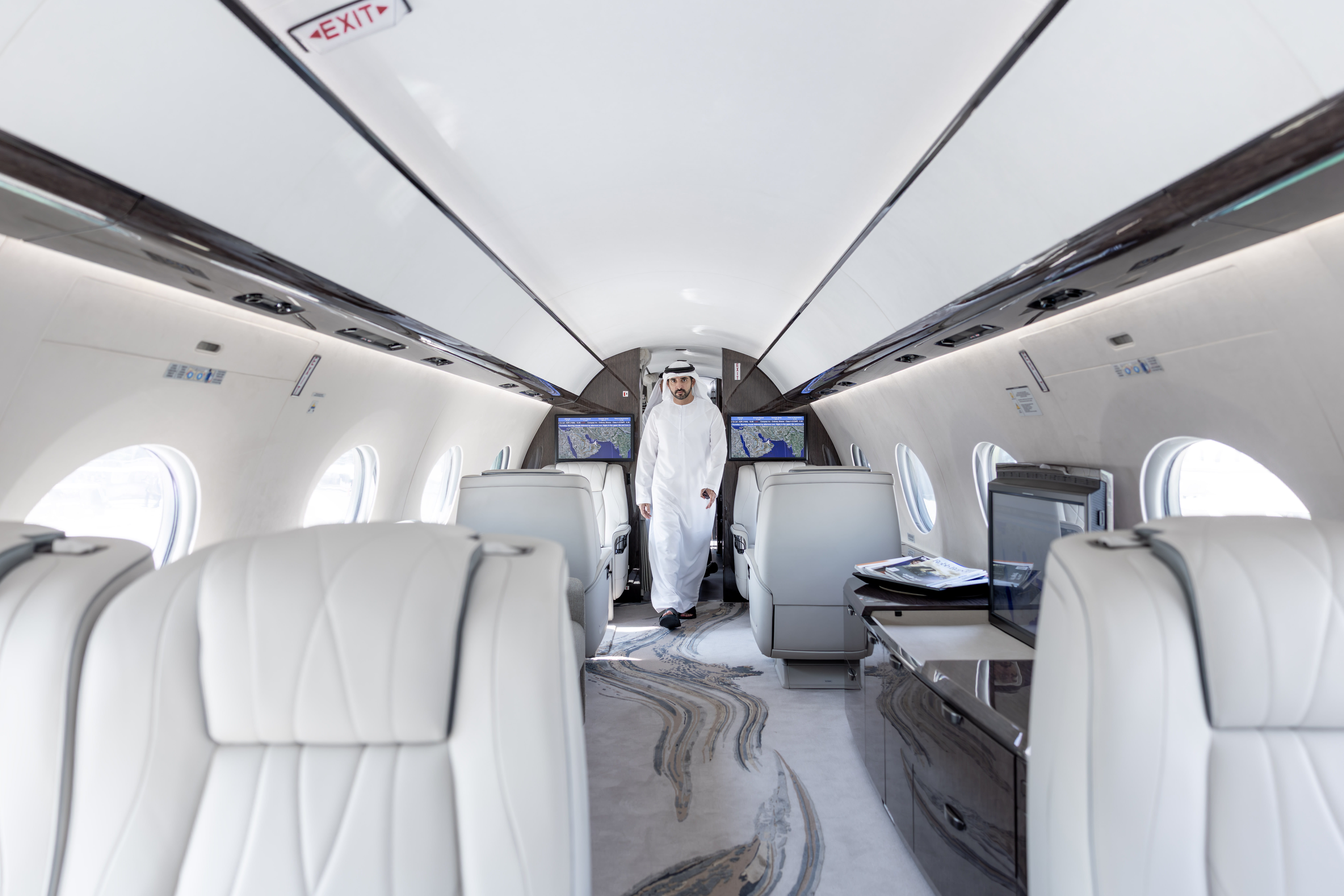 His Highness Sheikh Hamdan bin Mohammed bin Rashid Al Maktoum inspected the Bombardier Global 7500, a 19-seat aircraft with a range of 7,500 nautical miles (upgradeable to 8,000) that combines high-speed, high-altitude performance with a modern, tech-enabled cabin.