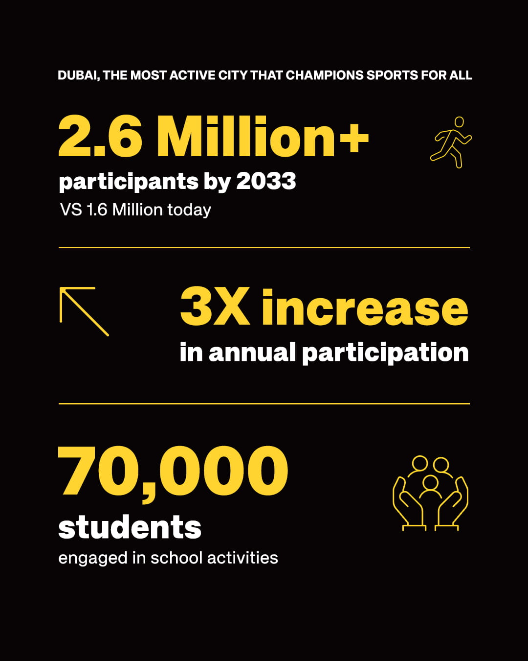 His Excellency Khalfan Jumaa Belhoul, Vice Chairman of the Dubai Sports Council, said: “This Plan aims to enhance community well-being and overall quality of life. Our goal is for Dubai to be the most active and sports-friendly city in the world, and we will work to triple the number of people actively engaged in sports in Dubai to reach 2.6 million by 2033.”