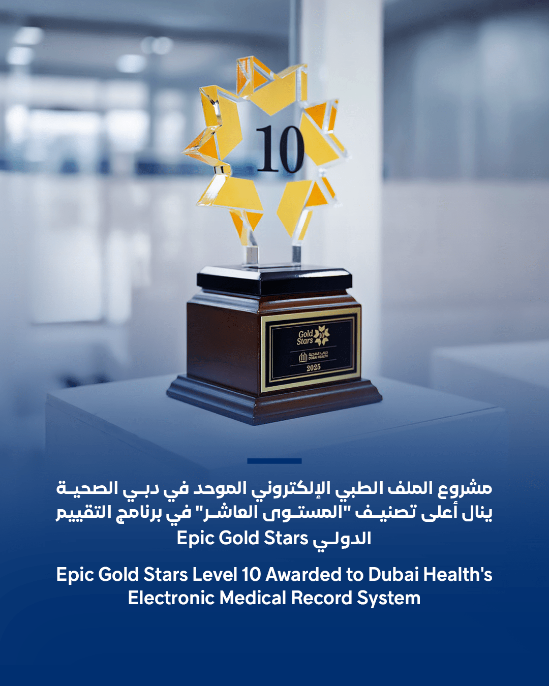 Dubai Health has received the Epic Gold Stars Level 10 designation for its Electronic Medical Record (EMR) system ranking it among the top 3% of healthcare institutions worldwide using the Epic system to receive this recognition. Epic’s Gold Stars Program is a global, 10-level system that evaluates healthcare institutions’ readiness in adopting and utilizing Epic’s EMR system. Level 10, the program’s highest distinction, is awarded to institutions that use more than 95% of the system’s Gold Star features.
