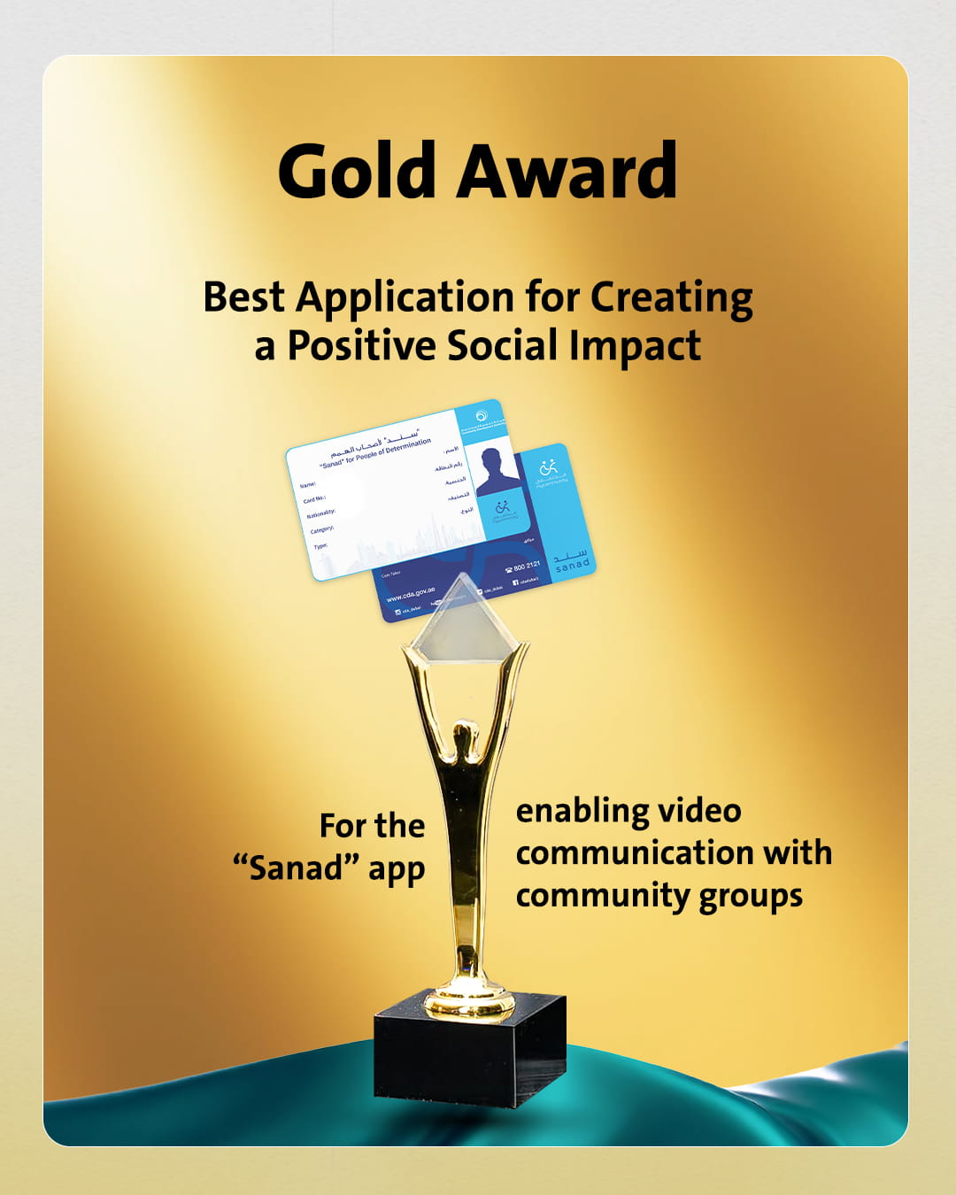 CDA’s 'Sanad' App earned the Gold Award for ‘Best Mobile App for Social Good’. The innovative application enables People of Determination, including the deaf and hearing impaired, to communicate instantly through sign language video calls, advancing accessibility and social inclusion.