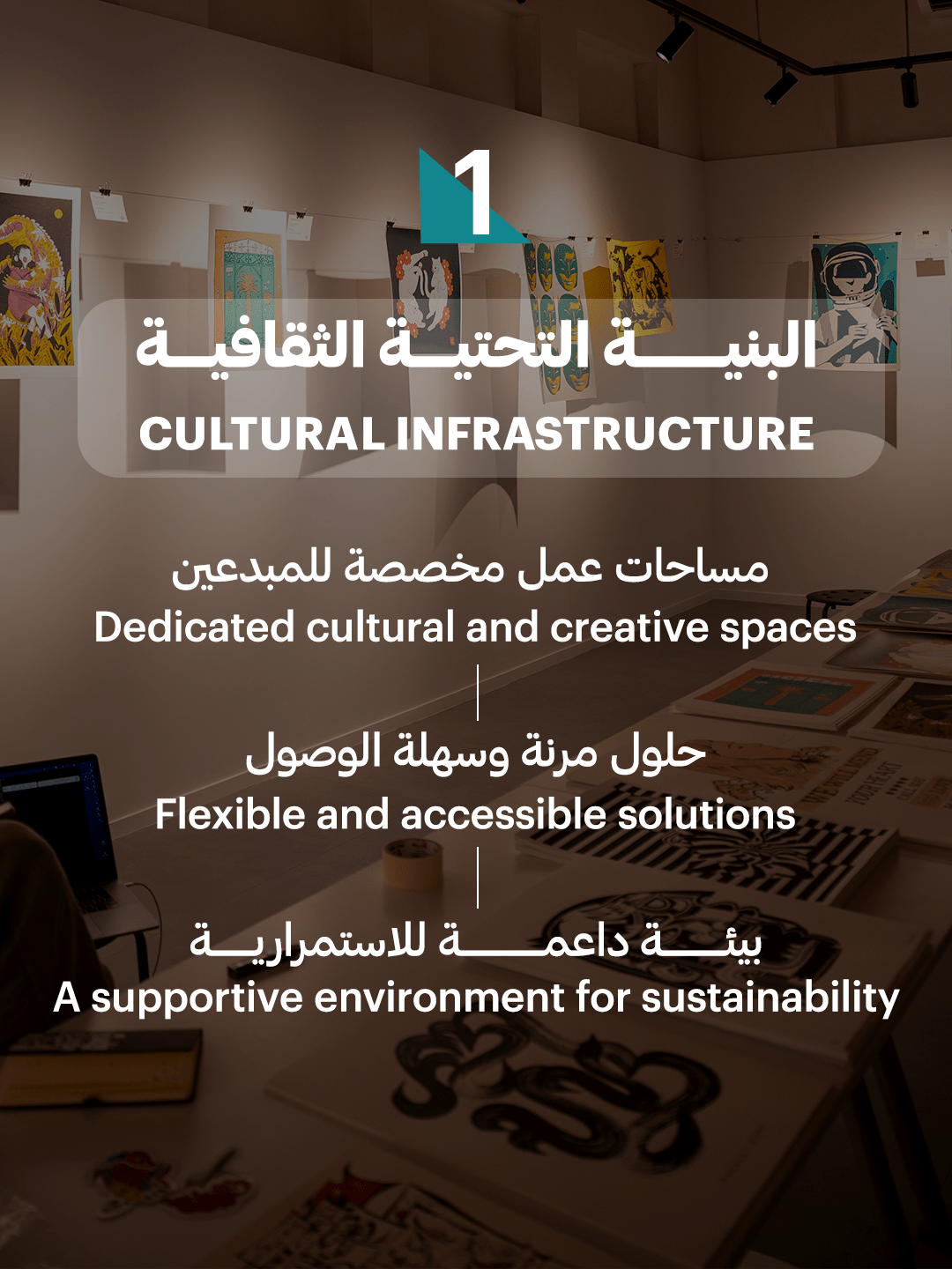 The Cultural Infrastructure pillar focuses on access to spaces and assets. Free, multi-purpose venues will be made available to members of the creative community in collaboration with Dubai Municipality, Dubai CommerCity, House of Arts at Expo City Dubai, Dubai Holding Asset Management, Dubai International Financial Centre, and Dubai South. Dubai Culture will also make dedicated space available within its own assets, with affordable workspace offered through Letswork, enabling creatives to showcase their work and build professional networks that support their visibility.