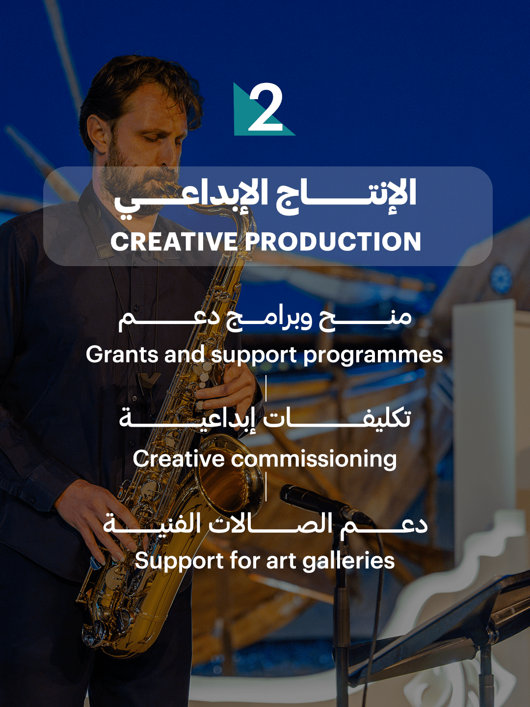 The Creative Production pillar supports funding and commissioning. It brings together the Dubai Cultural Grant, a micro-grants programme with Art Jameel, a micro-commissioning programme with Luxuriant Design (founded by Emirati entrepreneur Saeed Saif Al Ketbi), and an exhibition grant with Art Dubai.