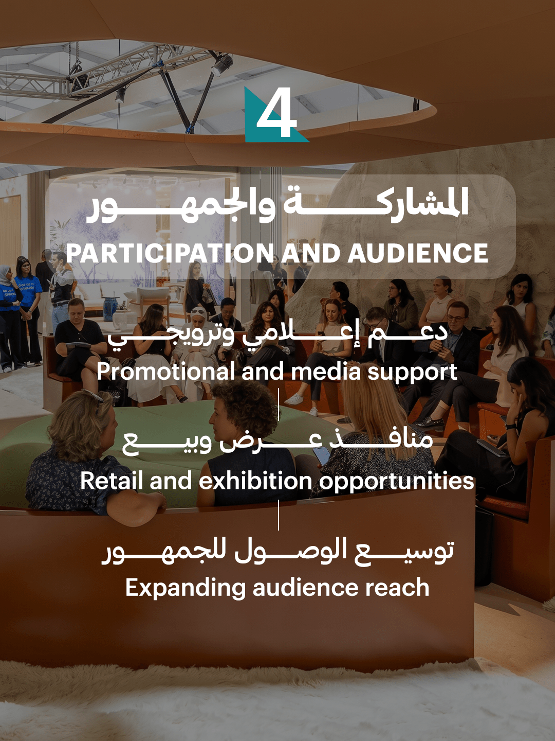 The Participation and Audience pillar covers promotional and media support across digital platforms to spotlight local talent, with retail and exhibition opportunities made available through Majid Al Futtaim's 'Ma'an' programme, which offers complimentary spaces within the group's assets.