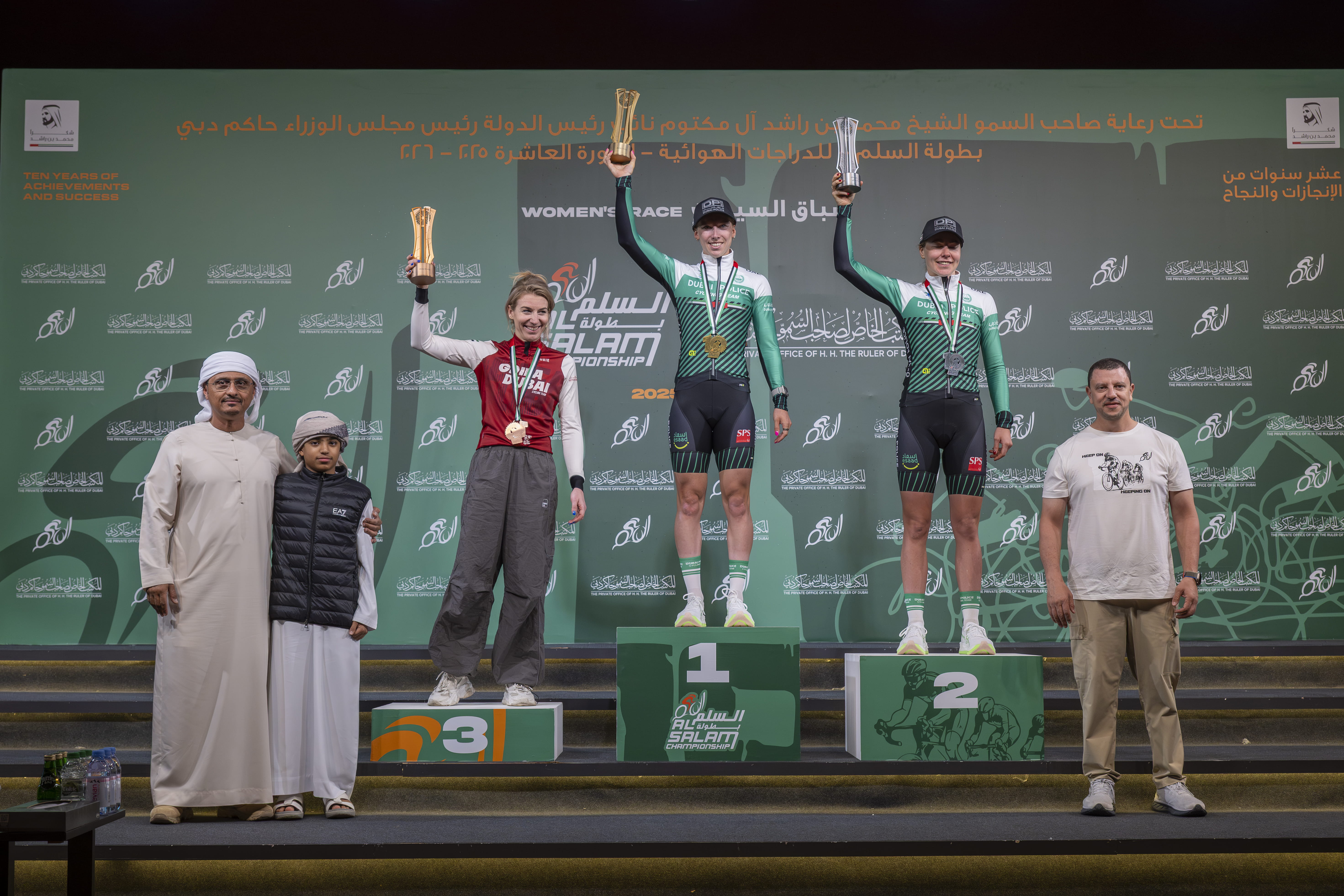 Under the patronage of His Highness Sheikh Mohammed bin Rashid Al Maktoum, Vice President and Prime Minister of the UAE and Ruler of Dubai, the Women’s Race held today as part of the 10th edition of the Al Salam Cycling Championship organised by the Private Office of His Highness the Ruler of Dubai, drew an impressive field, making for a thrilling contest right across the race route spanning 93 km.