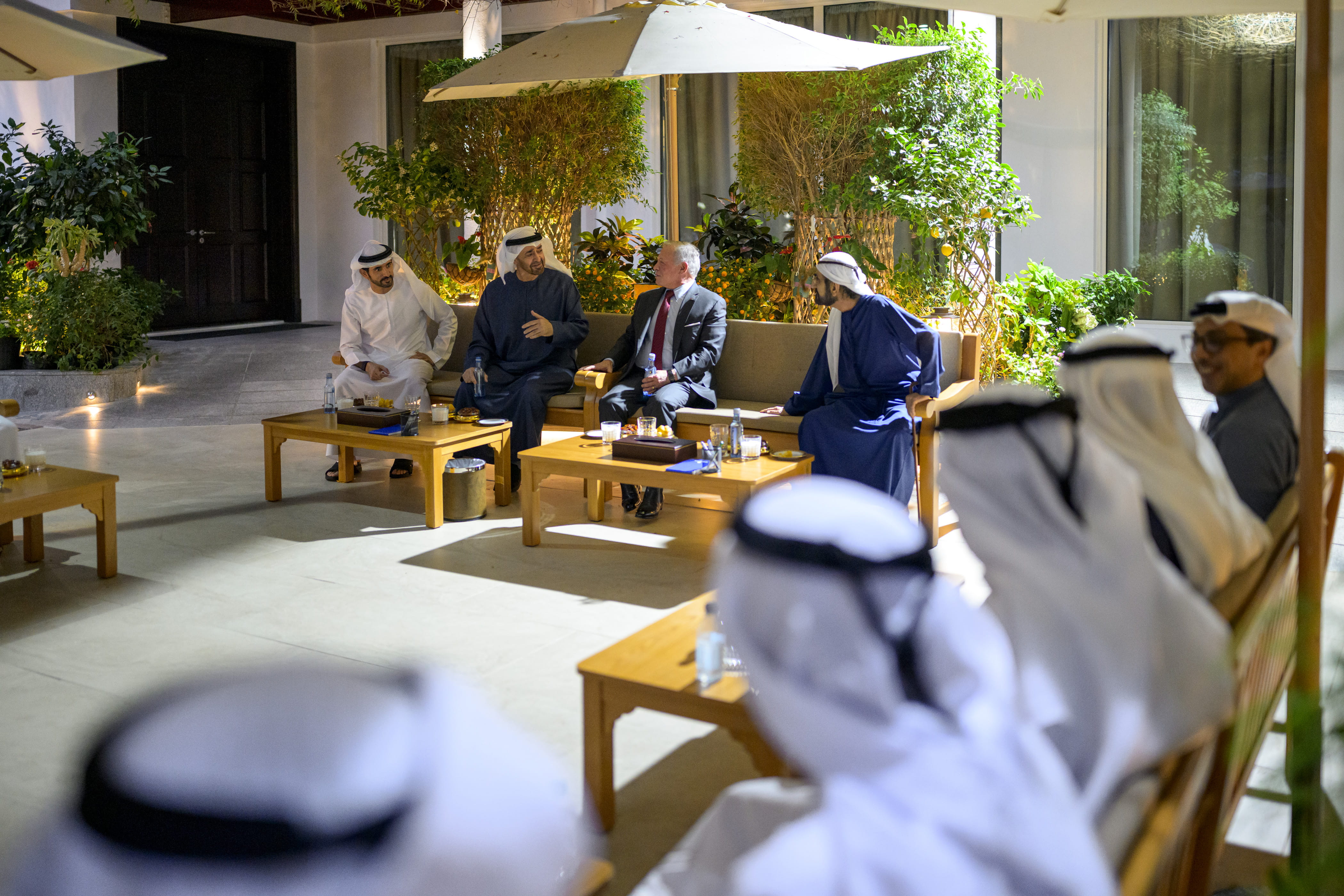 His Highness Sheikh Mohamed bin Zayed and His Majesty King Abdullah II, who is on a fraternal visit to the UAE, exchanged greetings and best wishes ahead of Eid Al-Fitr, wishing continued wellbeing, prosperity, and stability for their countries and peoples.
