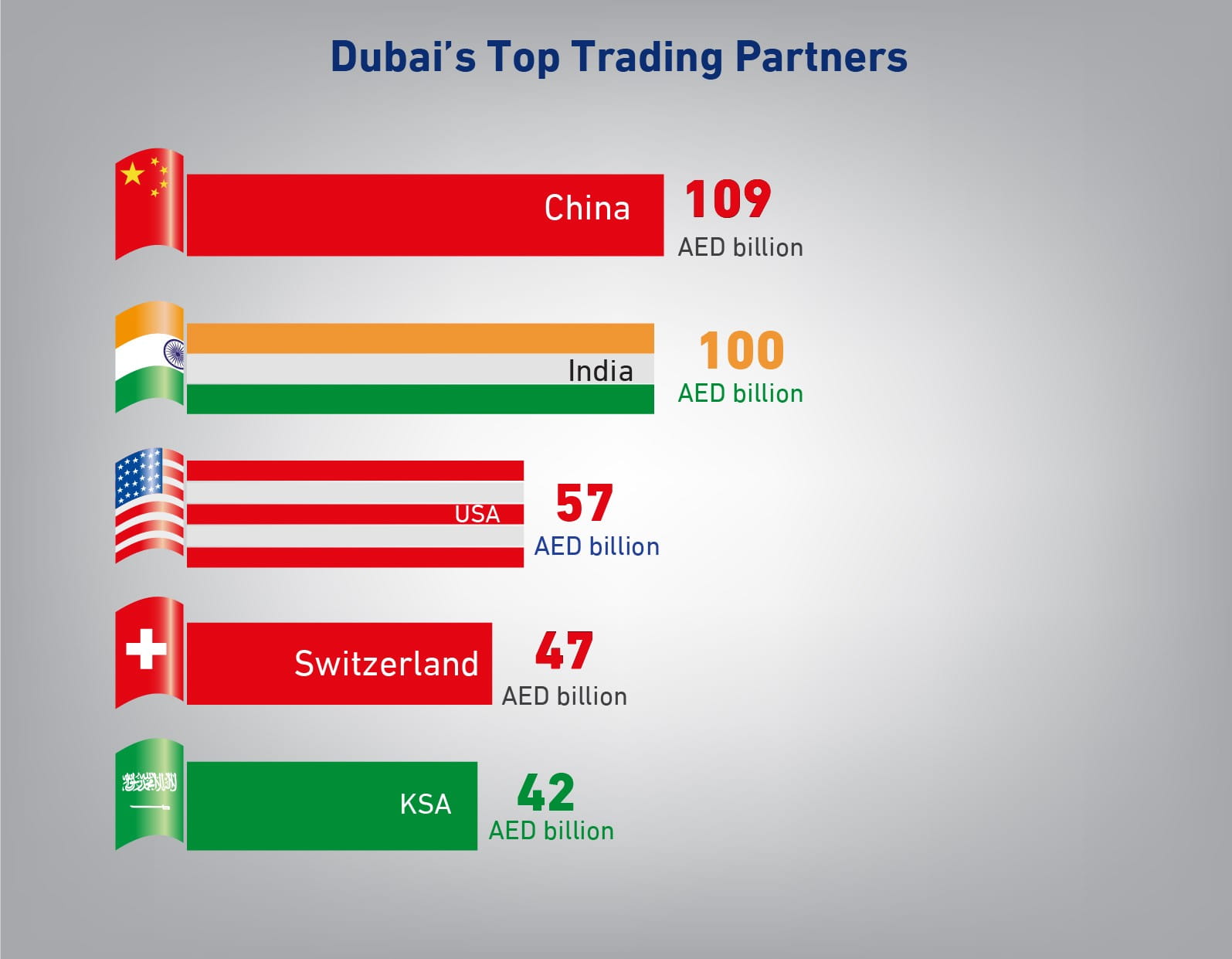 China remained Dubai’s largest trading partner, contributing AED109 billion, a 6 per cent increase. India was the second biggest trading partner, contributing AED100 billion, a growth of 16% per cent, followed by USA with AED57 billion and Switzerland with AED47 billion. Saudi Arabia maintained its position as Dubai’s largest Arab trade partner. The country was its fifth-biggest partner globally with AED42 billion worth of trade.