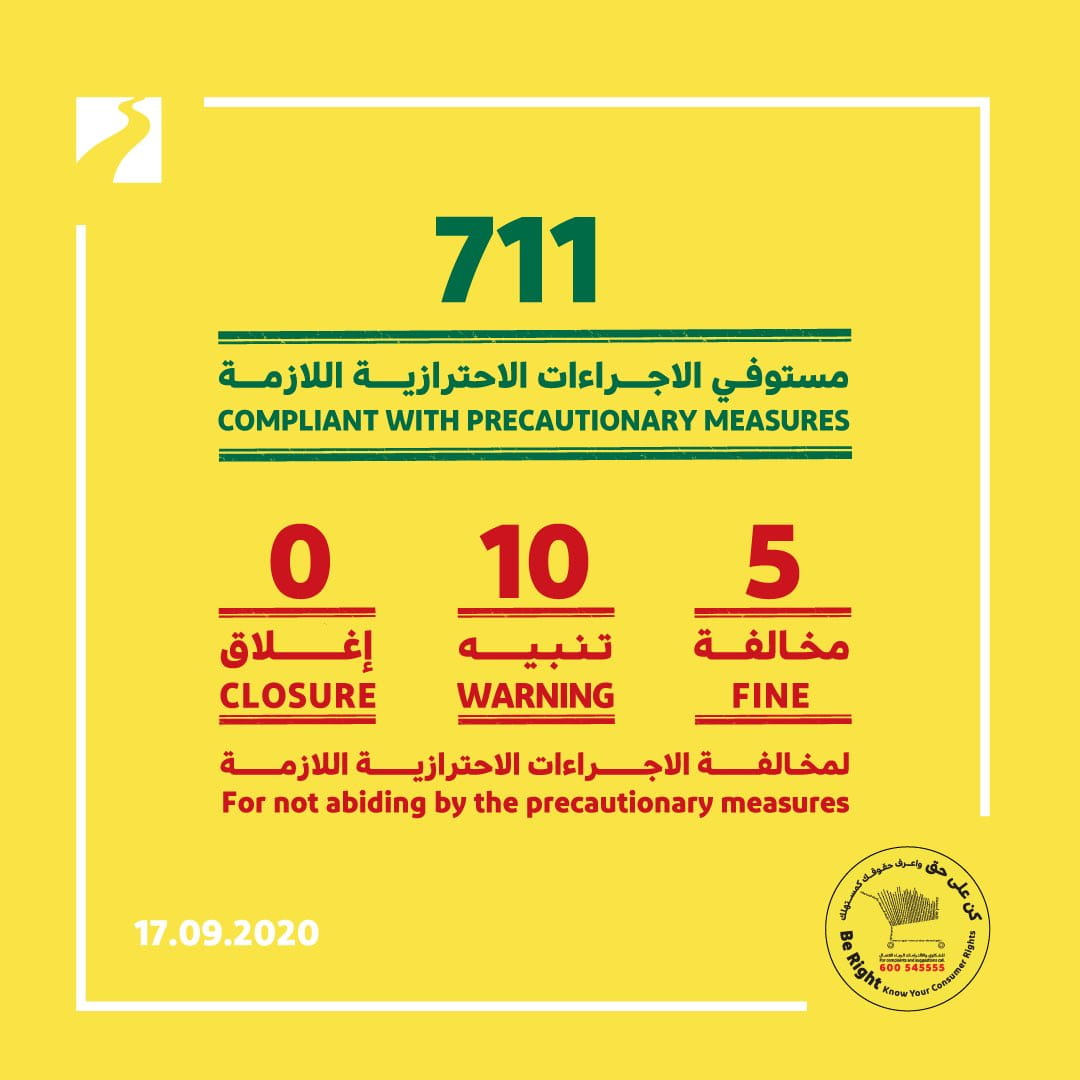 وأسفرت حملات التفتيش الميدانية عن إصدار 10 تنبيهات وجهت إلى منشآت تجارية في مختلف أنحاء الإمارة، وذلك لعدم وضع الملصقات الأرضية الخاصة بالتباعد الجسدي. وإضافة إلى ذلك، فقد كشفت الحملات ذاتها عن استيفاء الشروط والتدابير من قبل 711 منشأة غطتها تلك الجولات الهادفة أساسًا إلى ضمان الالتزام بتطبيق الإجراءات والتدابير الاحترازية الرامية، ونشر الوعي بين كافة شرائح المجتمع، للحد من تفشي فيروس "كوفيد - 19" المستجد.