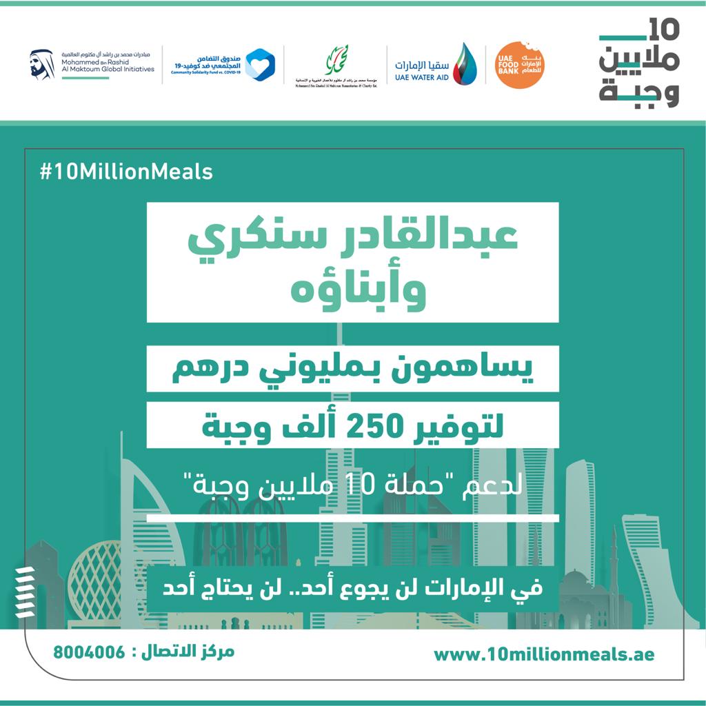 استمرارا لتدفق التبرعات من رجال الأعمال والشركات والمؤسسات وأفراد المجتمع دعماً لحملة "10 ملايين وجبة" الحملة المجتمعية الأكبر وطنياً، تبرع الدكتور عبدالقادر سنكري، رئيس مجلس إدارة مجموعة سنكري للاستثمار، وأبناؤه بمليوني درهم كدفعة أولى من مساهمته في الحملة.
