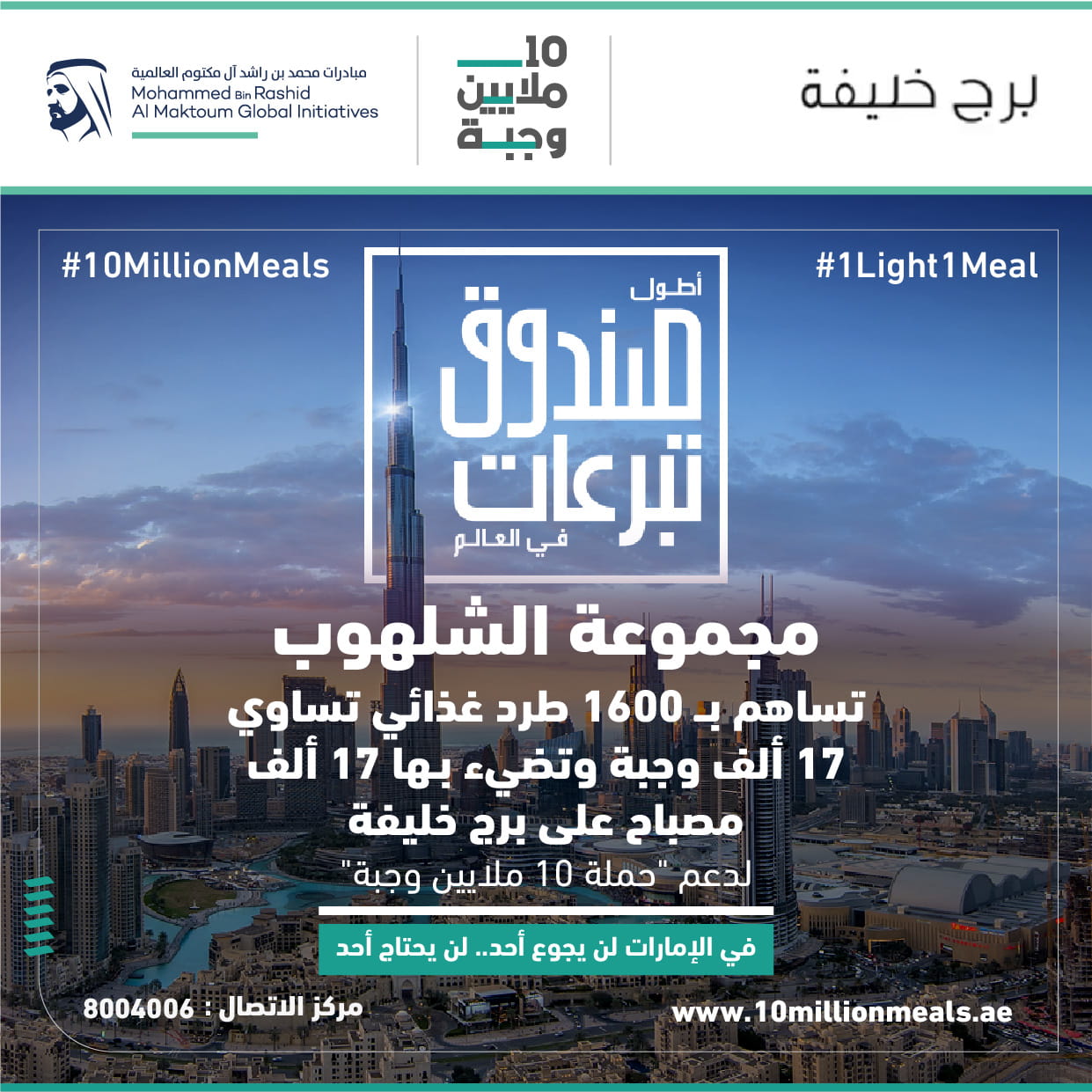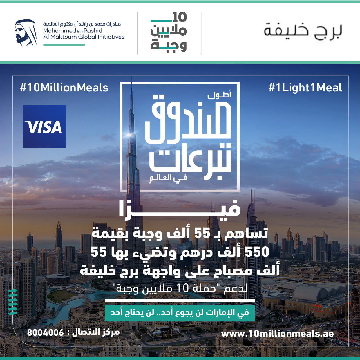 وتلتقي مساهمات الأفراد والشركات والمؤسسات معاً لتحقيق هدف إضاءة 1.2 مليون مصباح على واجهة برج خليفة، أطول صرح عمراني في العالم، كرسالة تضامن عالمية مع المتضررين من تداعيات وباء كوفيد-19، وتقدم في الوقت نفسه 1.2 مليون وجبة لصالح "حملة 10 ملايين وجبة" التي انطلقت بتوجيهات صاحب السمو الشيخ محمد بن راشد آل مكتوم، نائب رئيس الدولة رئيس مجلس الوزراء حاكم دبي "رعاه الله"، وبرعاية كريمة من سمو الشيخة هند بنت مكتوم بن جمعة آل مكتوم، حرم صاحب السمو الشيخ محمد بن راشد آل مكتوم، رئيس مجلس أمناء بنك الإمارات للطعام، لتقدم الدعم الغذائي للأفراد والعائلات المتعففة والفئات الأقل دخلاً والشرائح الأكثر تضرراً جرّاء الأزمة الصحية العالمية.