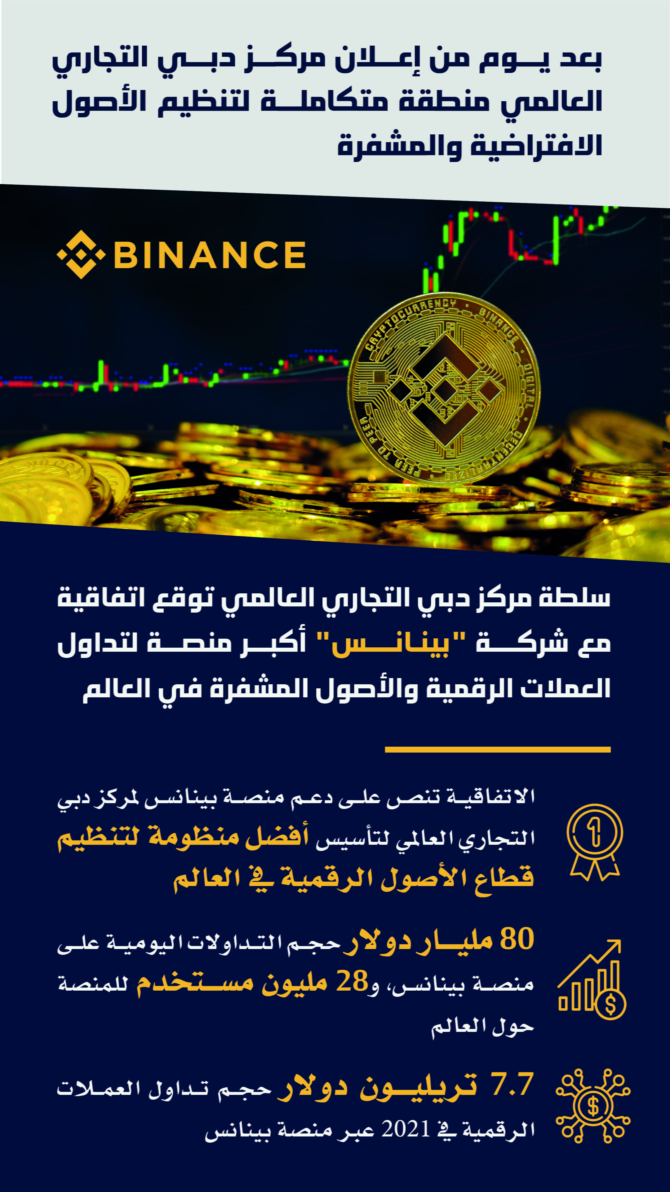 وتنص الاتفاقية على أن تقوم منصة "بينانس" بدعم مركز دبي التجاري العالمي لتأسيس أفضل منظومة لتنظيم قطاع الأصول الرقمية في العالم، وتعد "بينانس" من الشركات الرائدة في هذا المجال حيث يبلغ حجم التداولات اليومية على منصتها ما يعادل 80 مليار دولار، ويصل عدد مستخدميها حول العالم 28 مليون مستخدم، فيما وصل حجم تداول العملات الرقمية على المنصة خلال العام 2021 ما يعادل 7.7 تريليون دولار.