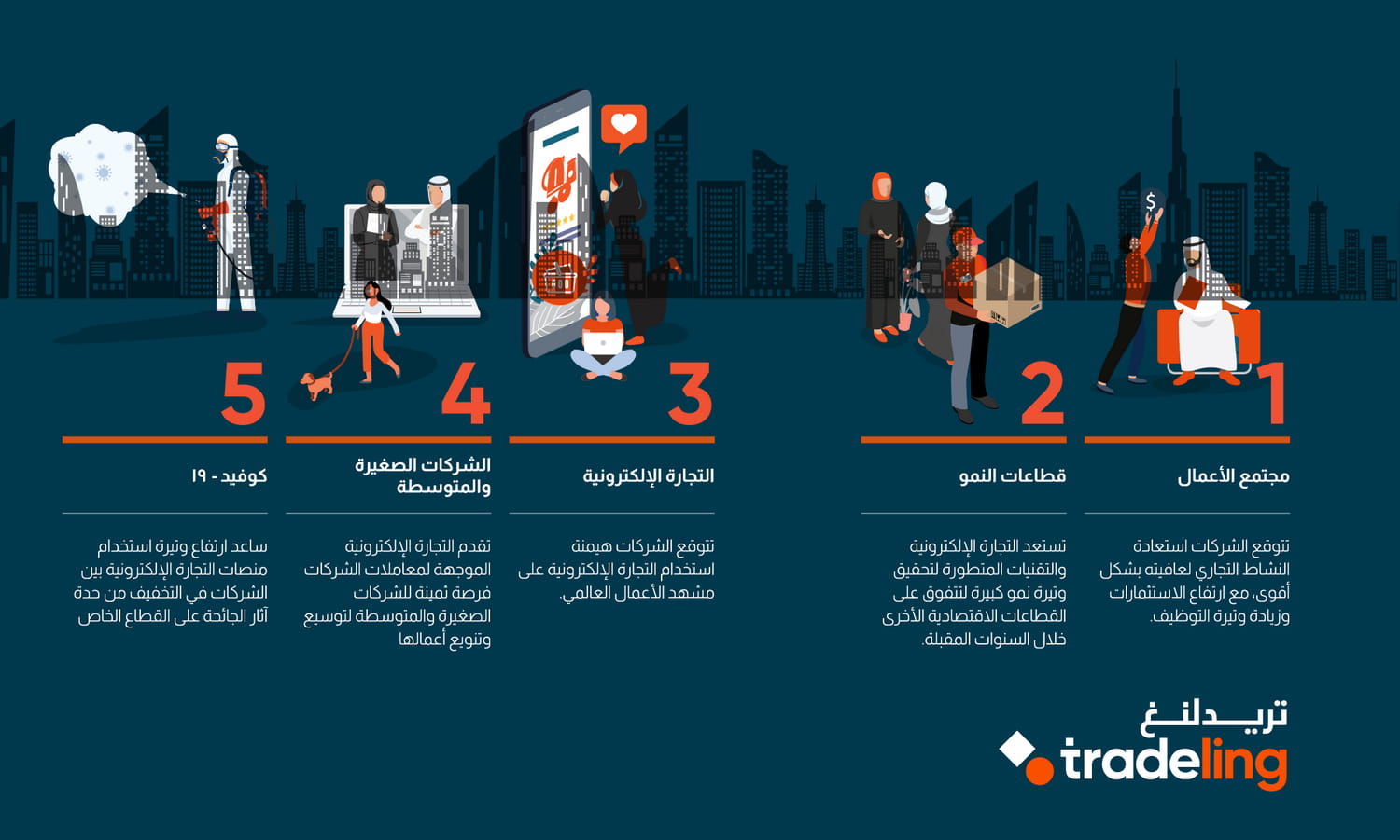 وتُعتبر هذه الدراسة من أولى الدراسات المرجعية التي تتناول تأثيرات الجائحة على التجارة والثقة بقطاع الأعمال في المنطقة، وتركّز على خمسة مجالات رئيسية تشمل: مجتمع الأعمال، والقطاعات المتنامية، والتجارة الإلكترونية، والشركات الصغيرة والمتوسطة، وجائحة كوفيد-19.