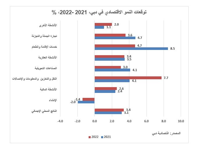 واعتماداً على التطورات العالمية التي قد تحدث خلال الفترة القادمة، والتعافي الملحوظ بدايةً من الربع الثاني خاصة في الأنشطة التي سجلت شبه توقف تام في شهري أبريل ومايو من عام 2020، تتوقع اقتصادية دبي أن يشهد اقتصاد الإمارة نمواً يصل إلى 3.1% خلال عام 2021. كما تعتمد هذه التوقعات على انعكاسات فعاليات إكسبو 2020 المنتظرة على الأنشطة الاقتصادية. ومن المتوقع أن يشهد قطاع خدمات الإقامة والفنادق نمواً بـــمعدل 8.5 بالمائة عام 2021 مقارنة مع عام 2020، ومن المتوقع أن ينمو قطاع النقل والتخزين والاتصالات بـــ 4.1 بالمائة مما يعكس التعافي التدريجي المتوقع حتى نهاية عام 2021 في أنشطة السياحة والنقل. ويتوقع أن تستعيد تجارة الجملة والتجزئة جزءاً كبيراً من نشاطها لتحقق نمواً بــــ 4.7 بالمائة في 2021. أما نشاط الإنشاء فيتوقع أن يتراجع في 2021 بـــ 2 بالمائة نتيجة شبه الاستقرار في مستوى البناء السكني والمكاتب والفنادق وتراجعاً نسبياً في البناء المتعلق بالبنية التحتية بعد النمو السريع الذي شهده في السنوات قبل 2020.