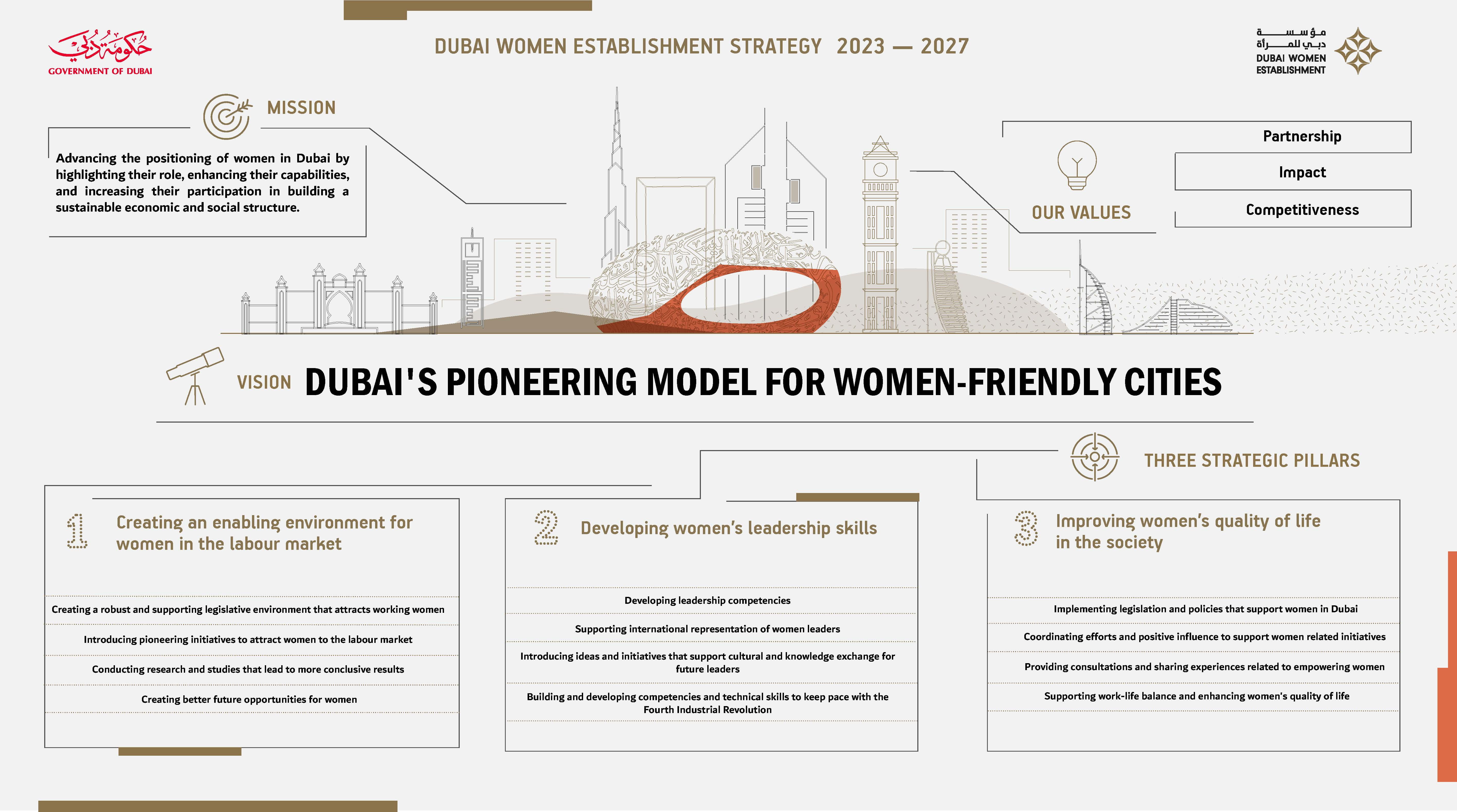 تحقيقاً لرؤية صاحب السمو الشيخ محمد بن راشد آل مكتوم نائب رئيس الدولة رئيس مجلس الوزراء حاكم دبي، رعاه الله، الداعمة للمرأة وترسيخ مشاركتها في مسيرة التنمية في المجالات كافة، أطلقت مؤسسة دبي للمرأة خطتها الاستراتيجية 2023-2027.