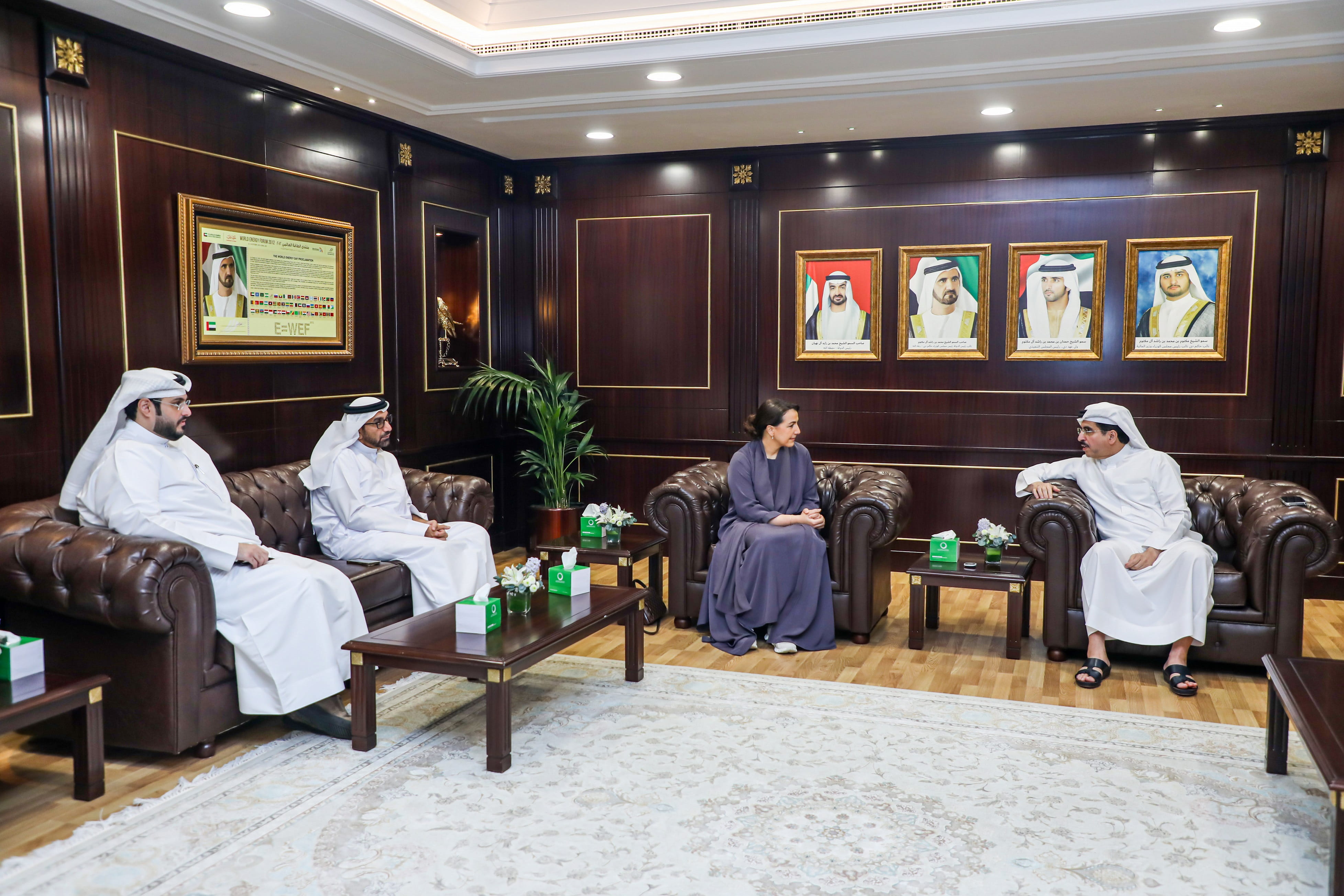 استقبل معالي سعيد محمد الطاير، العضو المنتدب الرئيس التنفيذي لهيئة كهرباء ومياه دبي، معالي مريم بنت محمد المهيري، وزيرة التغير المناخي والبيئة، وسعادة هشام عبدالله القاسم، الرئيس التنفيذي لمجموعة وصل لإدارة الأصول. هدفت الزيارة إلى مناقشة سبل التعاون في دعم مشروع وادي تكنولوجيا الغذاء، الذي أطلقه صاحب السمو الشيخ محمد بن راشد آل مكتوم، نائب رئيس الدولة رئيس مجلس الوزراء حاكم دبي، رعاه الله، في العام 2021 لمضاعفة إنتاج دبي الغذائي ثلاث مرات.