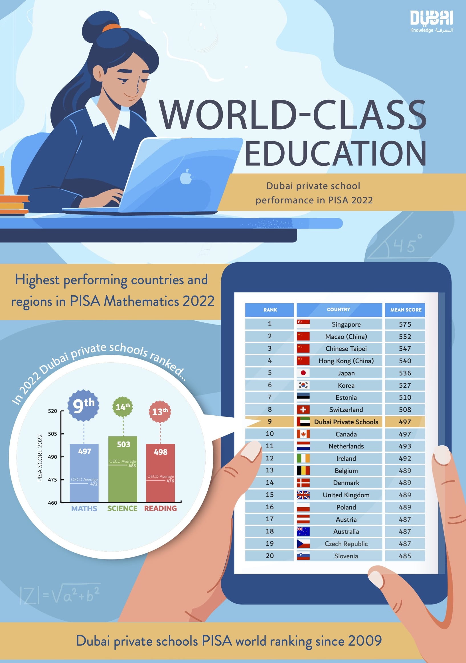 واحتلت المدارس الخاصة في دبي المرتبة التاسعة عالمياً في مهارات الرياضيات بمتوسط نقاط بلغ 497 نقطة، لتتخطى بذلك المتوسط العالمي المُعتمَد من منظمة التعاون والتنمية الاقتصادية بـ25 نقطة. كما احتلت المرتبة 13 عالمياً في مهارات القراءة بمتوسط نقاط بلغ 498، والمرتبة 14 عالمياً في مهارات العلوم بمتوسط نقاط بلغ 503 نقطة.