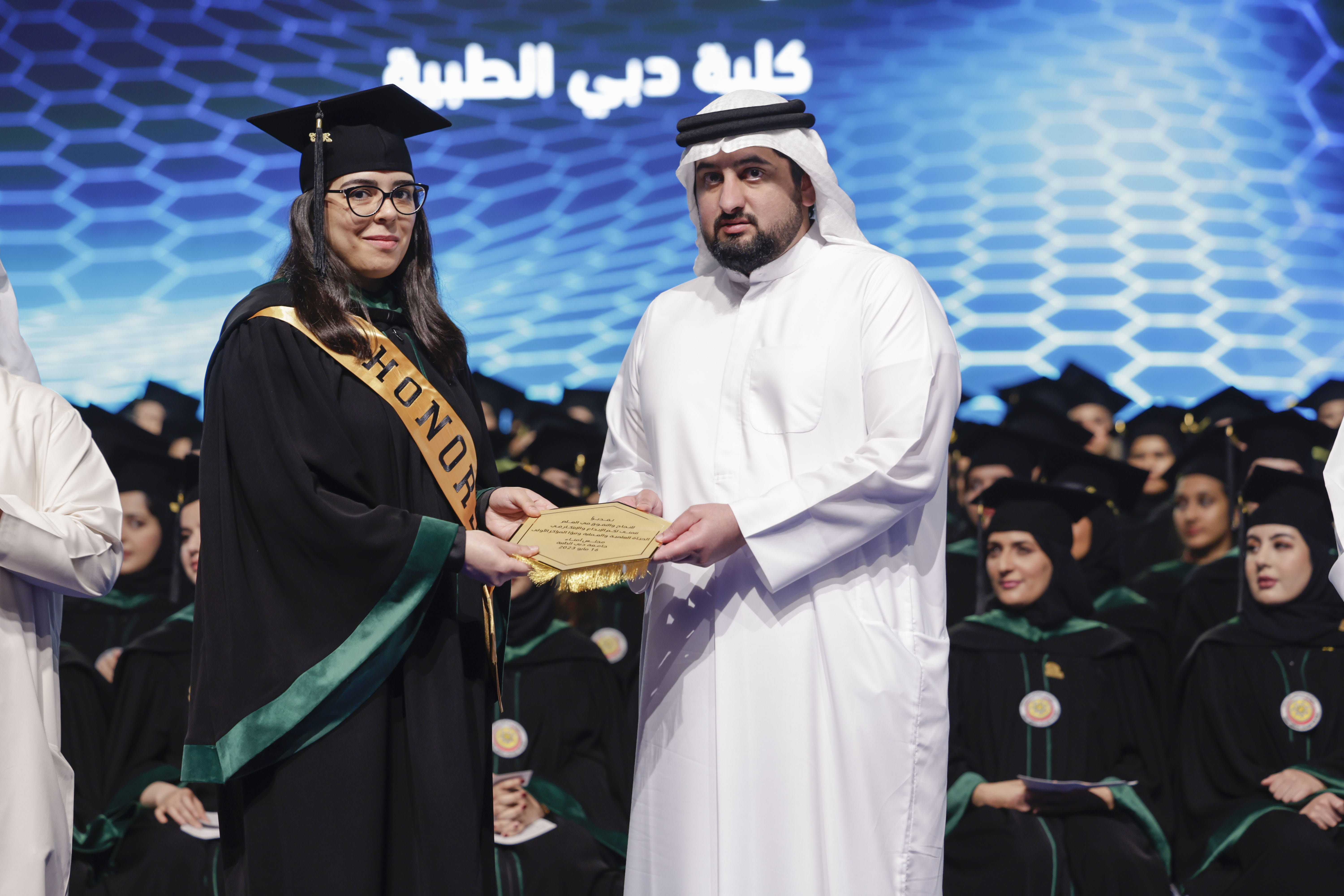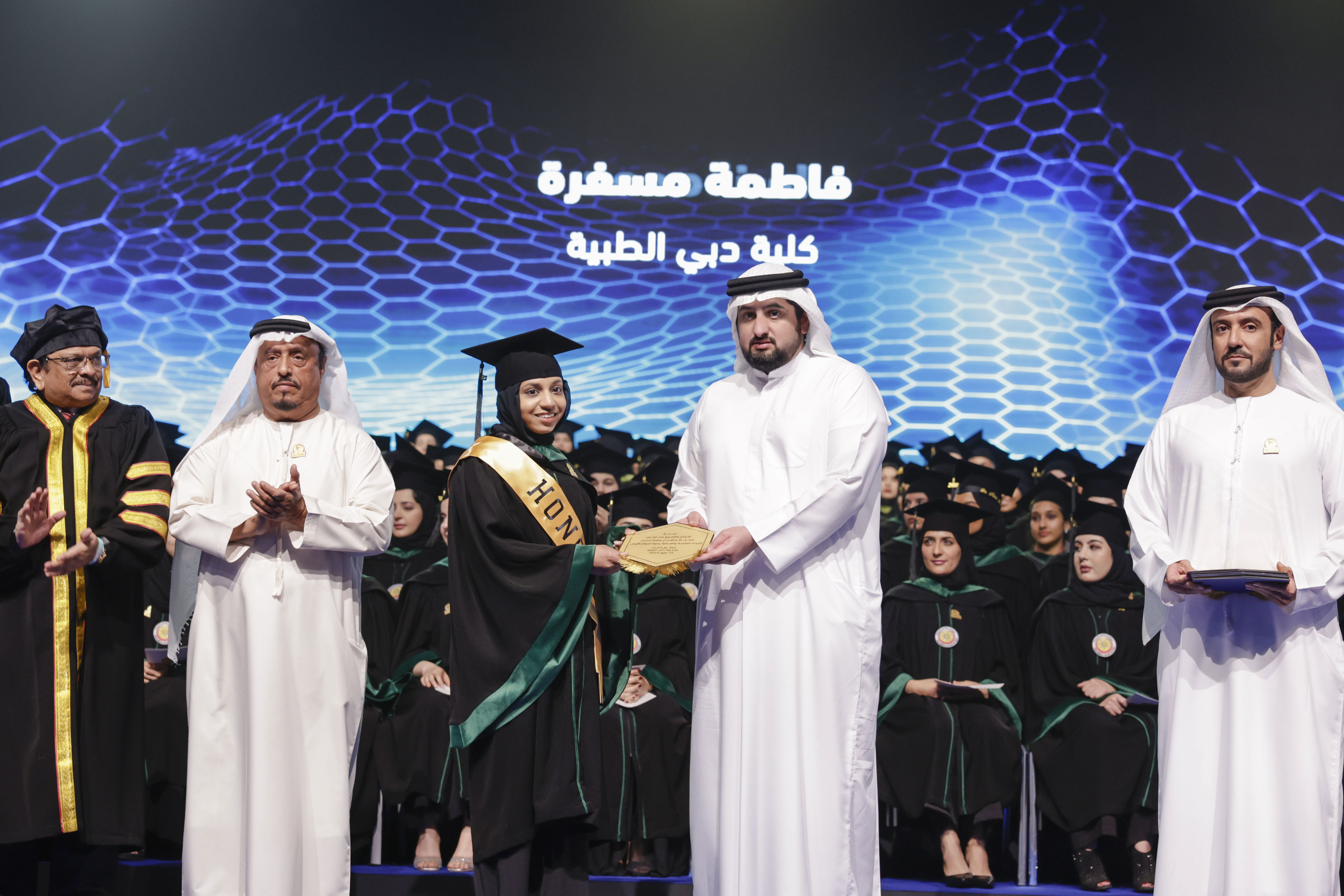 وقد شهد حفل التخرج، الذي أقيم في مركز دبي التجاري العالمي، معالي الدكتور أحمد بالهول الفلاسي، وزير التربية والتعليم، وسعادة عوض الكتبي، مدير عام هيئة الصحة بدبي، وسعادة الدكتور عامر أحمد شريف، المدير التنفيذي لمؤسسة دبي الصحية الأكاديمية، وعدد من المسؤولين والأساتذة الجامعيين وأهالي الخريجات.