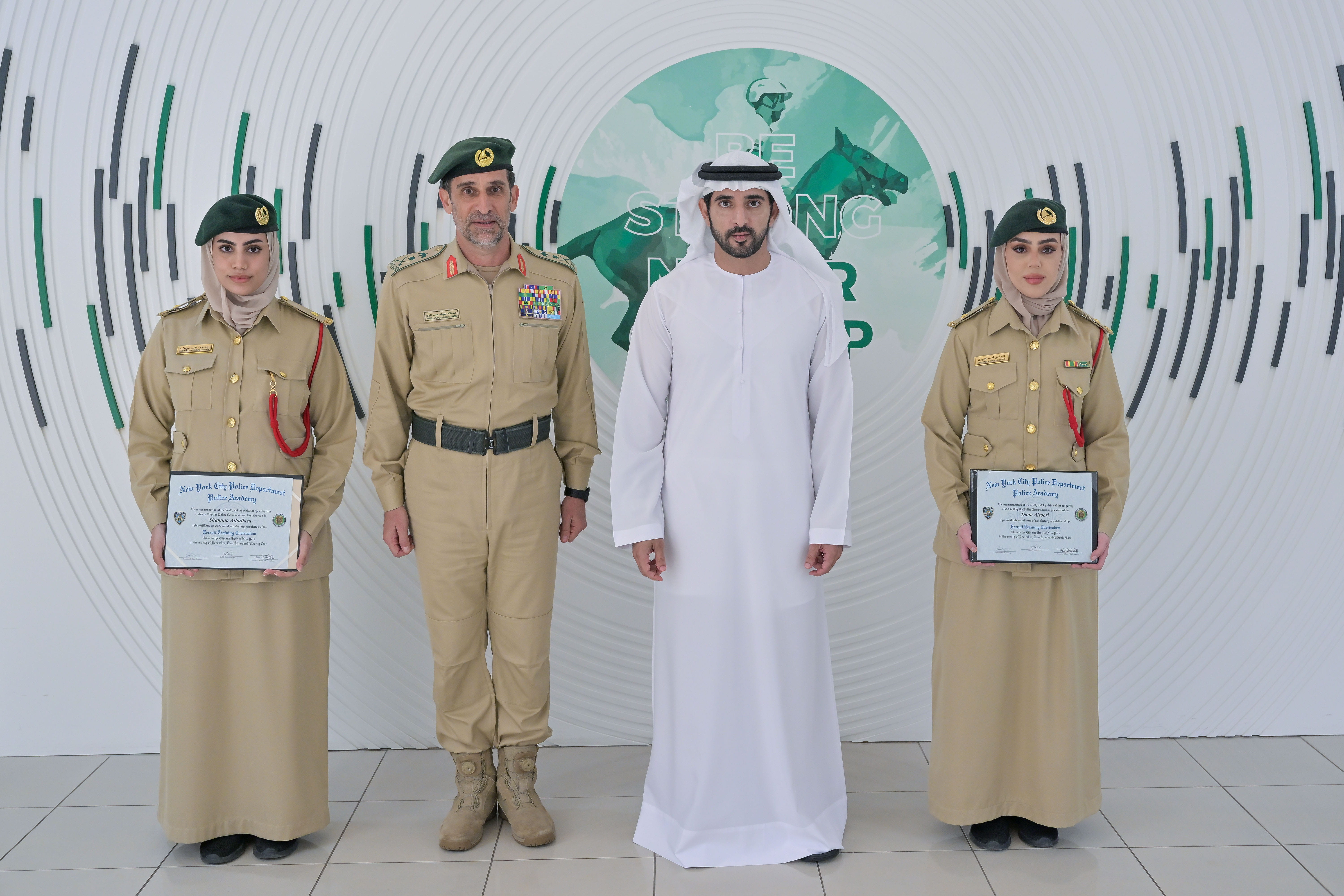 وخلال زيارة مقر نادي ضباط شرطة دبي، التقى سمو ولي عهد دبي بالملازم شماء البوفلاسة والملازم دانة الصوري من شرطة دبي، حيث أثنى سموه على تميزهما وتخرجهما بتفوق في برنامج إعداد الضباط بأكاديمية شرطة نيويورك، كأولى العناصر من الشرطة النسائية من دولة الإمارات التي تجتاز هذا التدريب النوعي من خارج الولايات المتحدة، وذلك في إطار حرص القيادة الرشيدة على تمكين المرأة الإماراتية، التي أثبتت مساهمتها الفعالة وتحقيقها للنجاحات المتتالية، معززة حضورها محلياً وإقليمياً وعالمياً في العديد من المجالات وعلى مختلف الصعد. وكانت الملازم شماء البوفلاسة والملازم دانة الصوري قد التحقتا ببرنامج تدريبي لمدة 6 أشهر بأكاديمية شرطة نيويورك، والتي تعد من أعرق القوات الشرطية في العالم بمسيرة عمرها 177 عاماً.