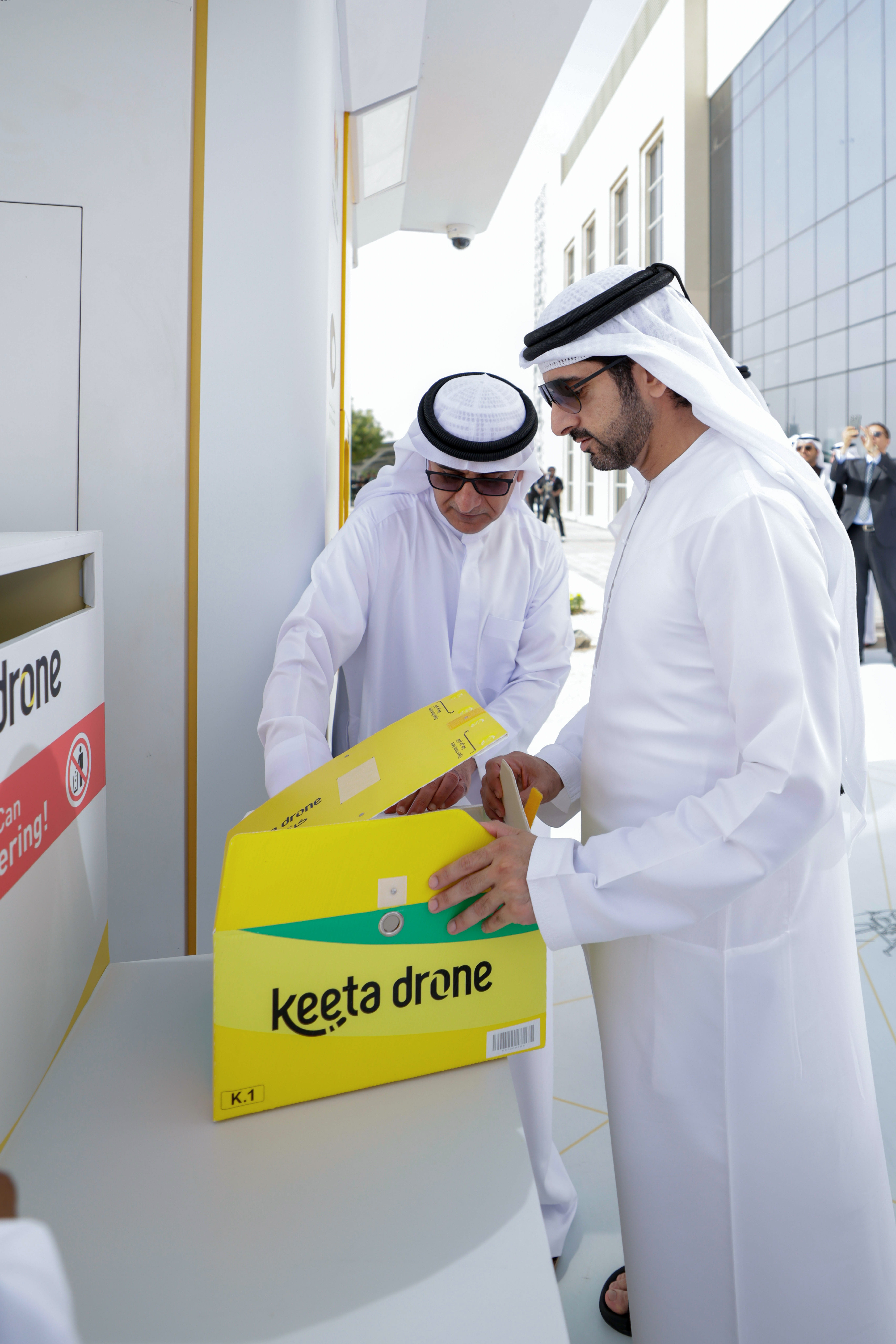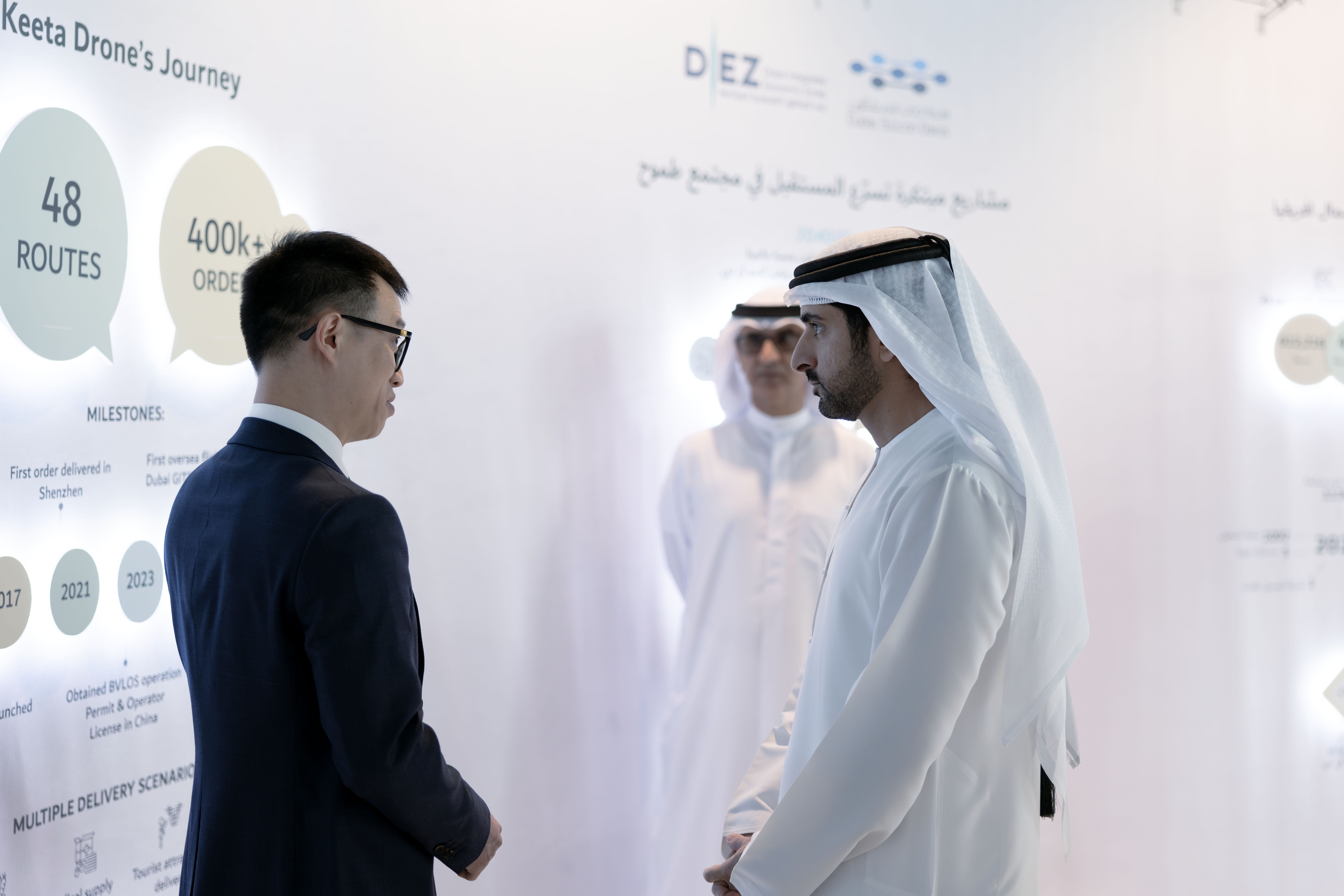 جاء ذلك خلال إطلاق سموّه، بحضور سموّ الشيخ أحمد بن سعيد آل مكتوم، رئيس هيئة دبي للطيران المدني رئيس مطارات دبي الرئيس الأعلى الرئيس التنفيذي لطيران الإمارات والمجموعة رئيس سلطة دبي للمناطق الاقتصادية المتكاملة، أول خدمة من نوعها في الشرق الأوسط للتوصيل باستخدام الطائرات بدون طيار، حيث دشّن سموّه طلب الخدمة الأول عبر المنصة المتواجدة في جامعة "روتشستر للتكنولوجيا -دبي"، التي تشكل إحدى نقاط الهبوط ضمن شبكة التوصيل المتكاملة بالطائرات بدون طيار في واحة دبي للسيليكون، فيما انطلق الطلب من إحدى نقاط التوصيل المعتمدة في الواحة.