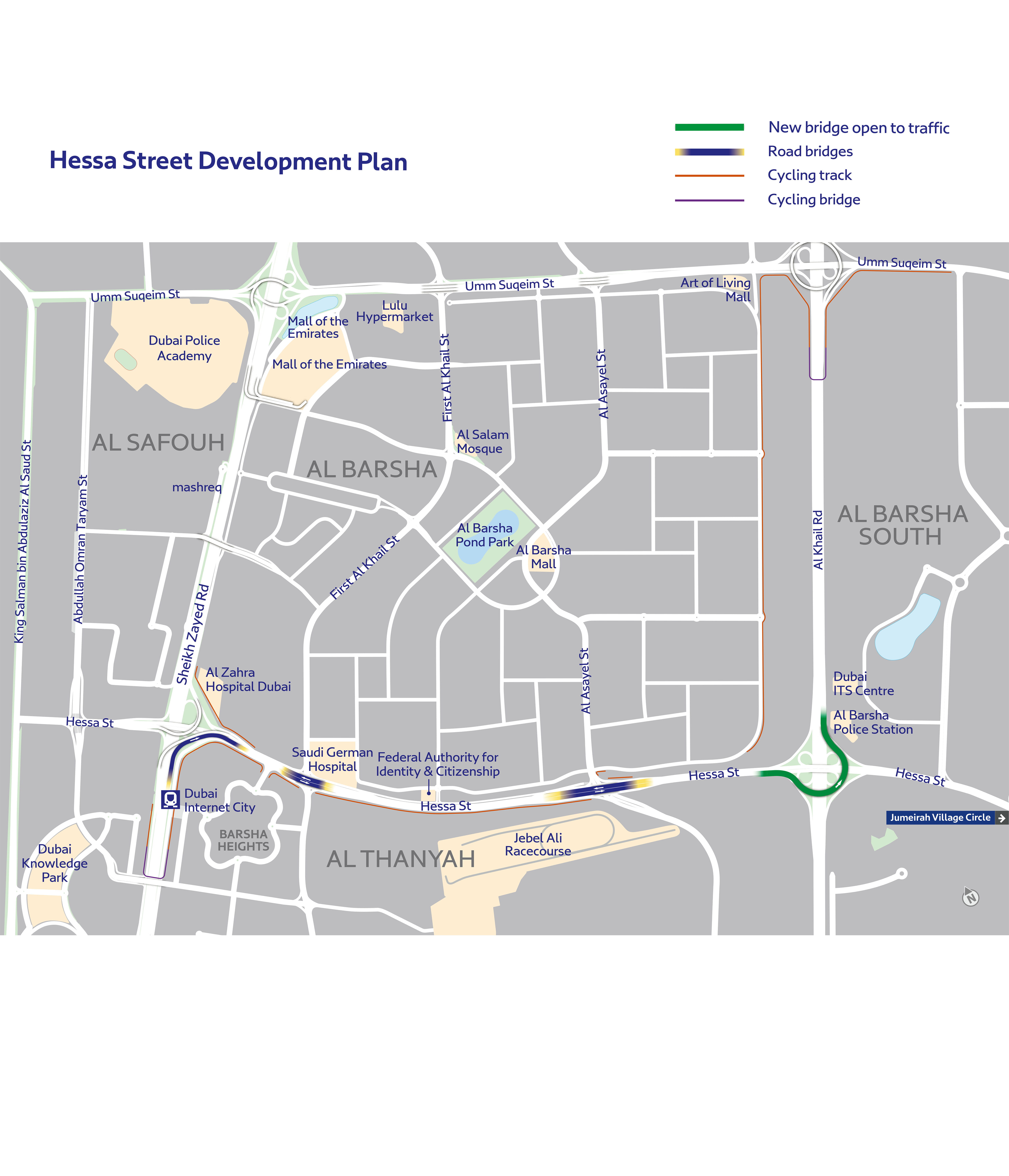 ويتضمن المشروع تطوير أربعة تقاطعات رئيسة، الأول: تقاطع شارع حصة مع شارع الشيخ زايد، بتنفيذ منحدر مجسر: (Directional Ramp)، بسعة مسارين، يمر فوق مسار الخط الأحمر لمترو دبي، ويخدم الحركة المرورية المتجهة يميناً من شارع الشيخ زايد إلى شارع حصة شرقاً باتجاه شارع الإمارات، والثاني: تطوير تقاطع شارع حصة مع شارع الخيل الأول، وذلك بزيادة عدد المسارات على الجسر القائم لشارع حصة، من ثلاثة مسارات إلى أربعة مسارات في كل اتجاه، وتنفيذ التحسينات المروية على التقاطع السطحي المحكوم بالإشارة الضوئية.