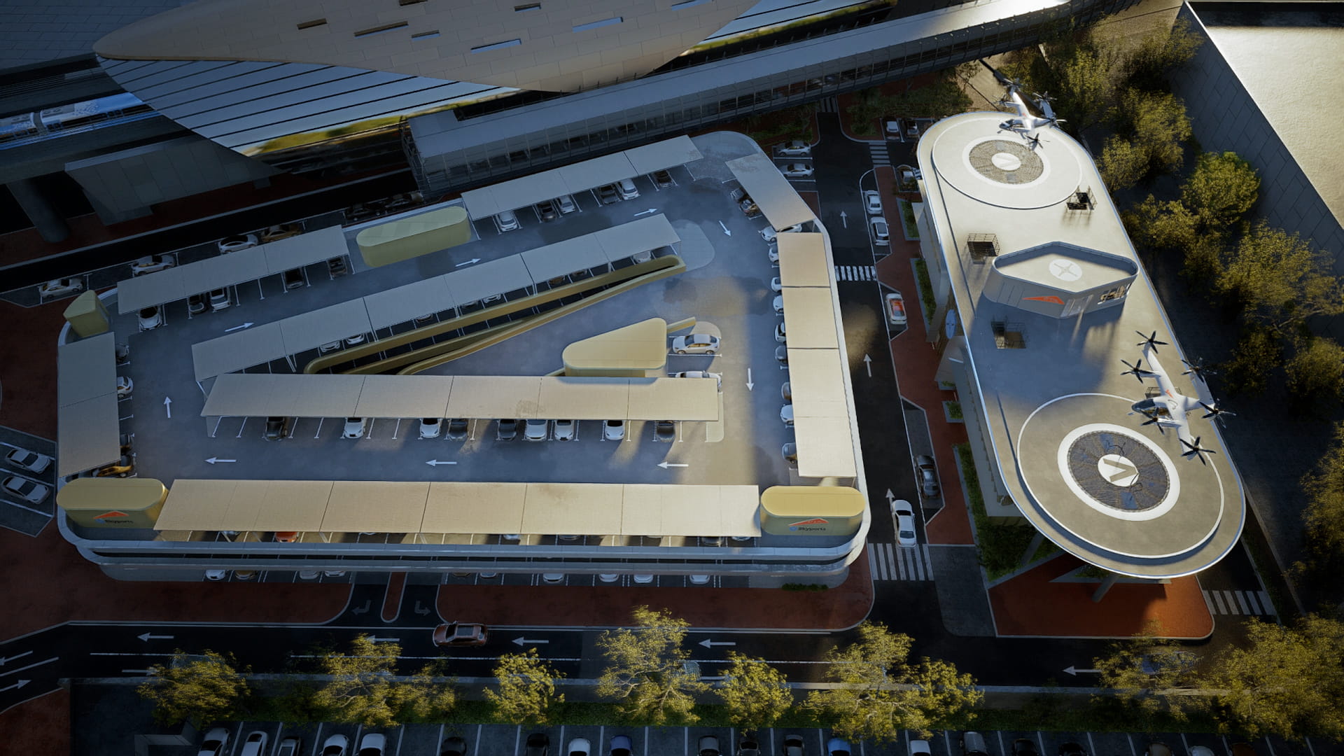 وتتكون محطة التاكسي الجوي من مبنى مقام على مساحة 3100 متر، ويضم مواقف للسيارات، ومنطقتين لإقلاع وهبوط التاكسي الجوي، ومواقف للتاكسي الجوي ومحطات لشحن مركباته، ومرافق مكيفة لاستقبال الركاب. وتقدّر الطاقة الاستيعابية القصوى للمحطة بنحو 42 ألف عملية هبوط للتاكسي الجوي سنوياً، لخدمة نحو 170 ألف راكب في العام الواحد.