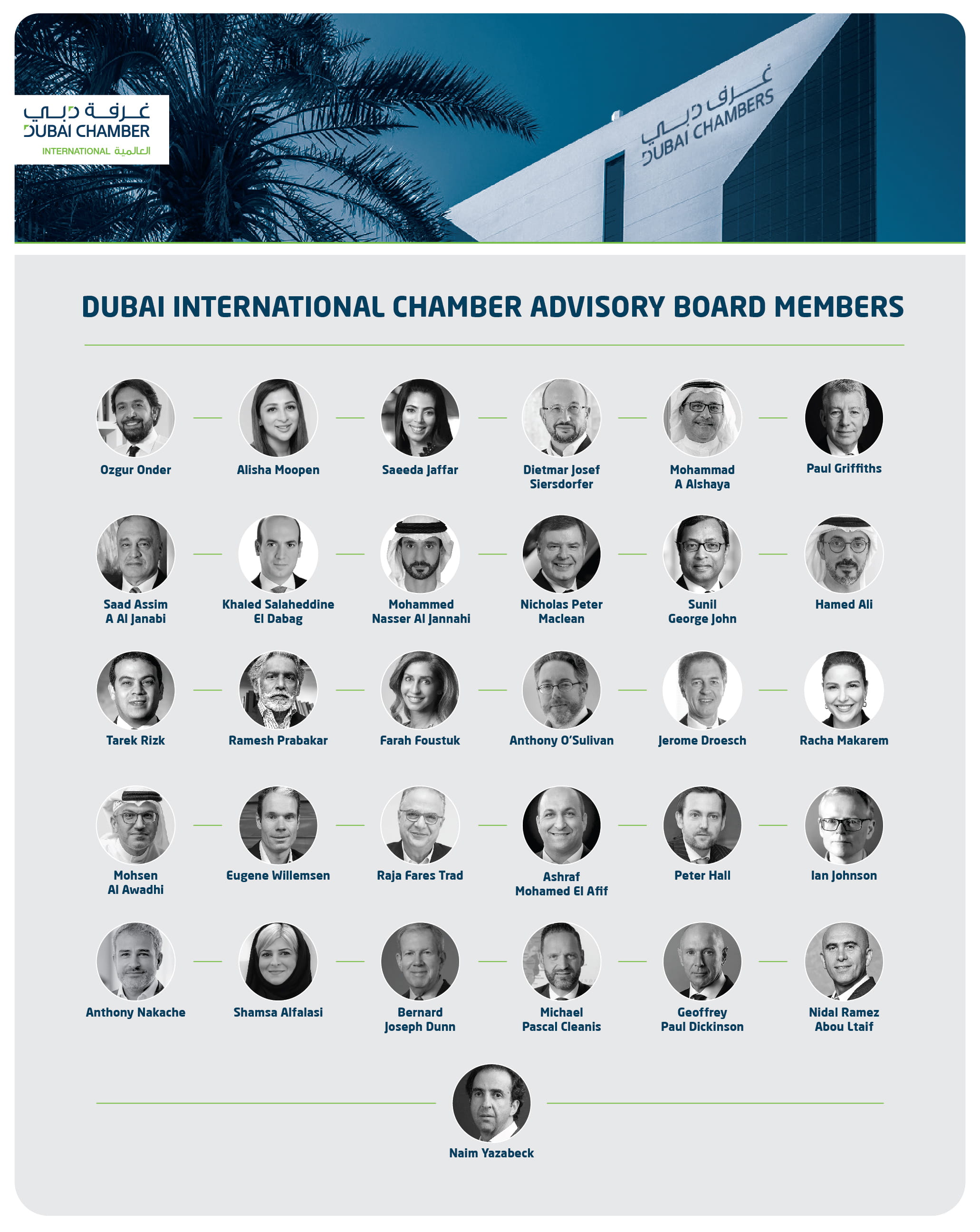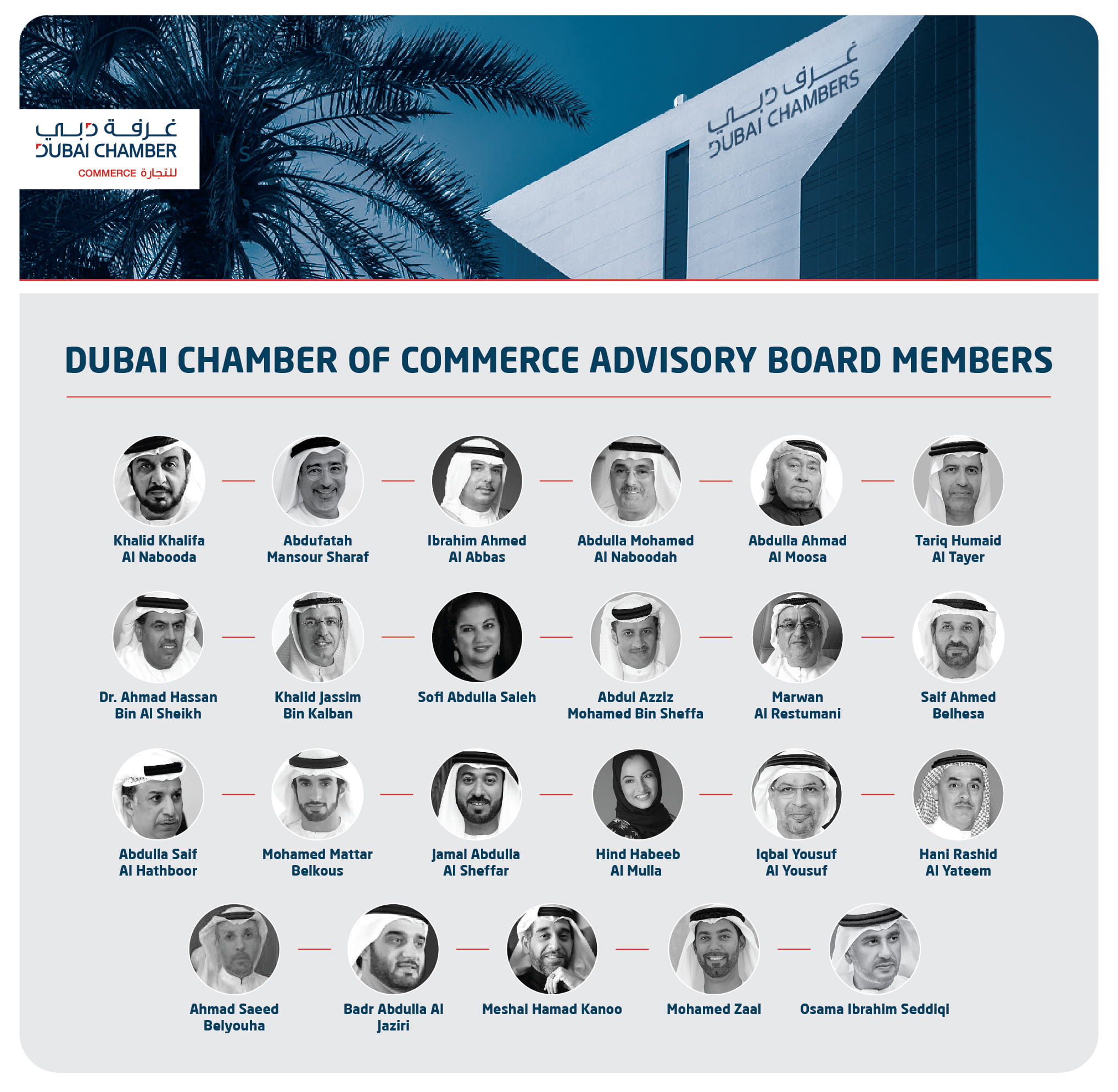 كما يضم المجلس الاستشاري لغرفة تجارة دبي كلاً من: الدكتور طارق حميد الطاير، وعبدالله أحمد الموسى، وعبدالله محمد النابودة، وإبراهيم أحمد العباس، و عبدالفتاح شرف، وخالد خليفة النابودة، وسيف أحمد بالحصا، ومروان الرستماني، وعبدالعزيز محمد بن شعفار، وصوفي عبدالله صالح، وخالد جاسم بن كلبان، والدكتور أحمد حسن بن الشيخ، وهاني راشد اليتيم، وإقبال يوسف اليوسف، وهند حبيب الملا، وجمال عبدالله الشعفار، ومحمد مطر بالكوس، وعبدالله سيف الحثبور، وأسامة إبراهيم صديقي، ومحمد زعل، ومشعل حمد كانو، وبدر عبدالله الجزيري، وأحمد سعيد باليوحه.
