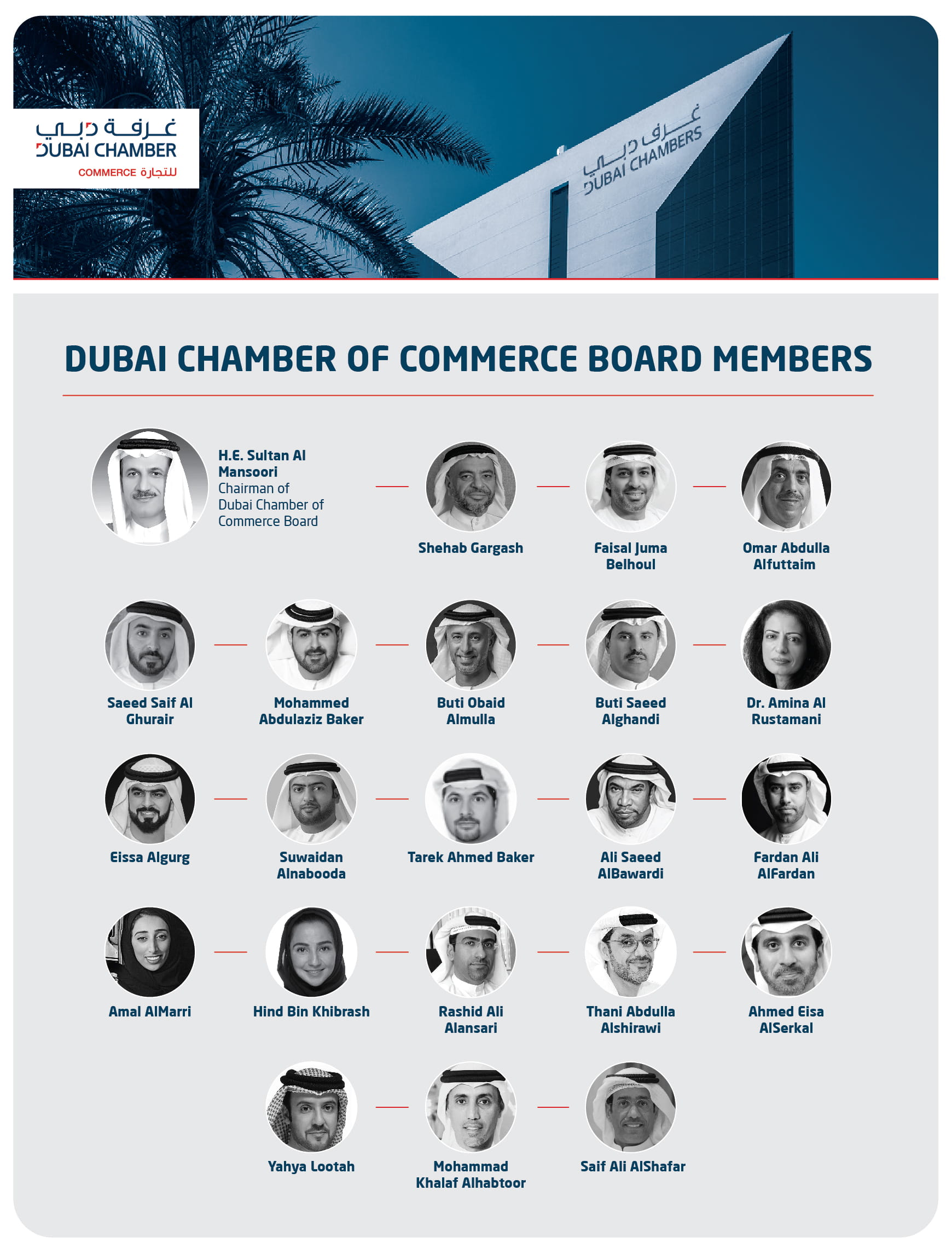 ويضم مجلس إدارة غرفة تجارة دبي معالي سلطان بن سعيد المنصوري رئيساً لمجلس الإدارة، وعضوية كل من عمر عبدالله الفطيم، وفيصل جمعة بلهول، والدكتورة أمينة عبدالواحد الرستماني، وبطي سعيد الكندي، وبطي عبيد الملا، ومحمد عبدالعزيز باقر، وفردان علي الفردان، وعلي سعيد البواردي، وطارق أحمد باقر، وسويدان سعيد النابودة، وأحمد عيسى السركال، وثاني عبدالله الشيراوي، وراشد علي الأنصاري، وهند محمد بن خرباش، وشهاب محمد قرقاش، وسعيد سيف الغرير، وعيسى فريد القرق، وأمل محمد المري، وسيف علي الشعفار، ومحمد خلف الحبتور، ويحيى سعيد لوتاه.