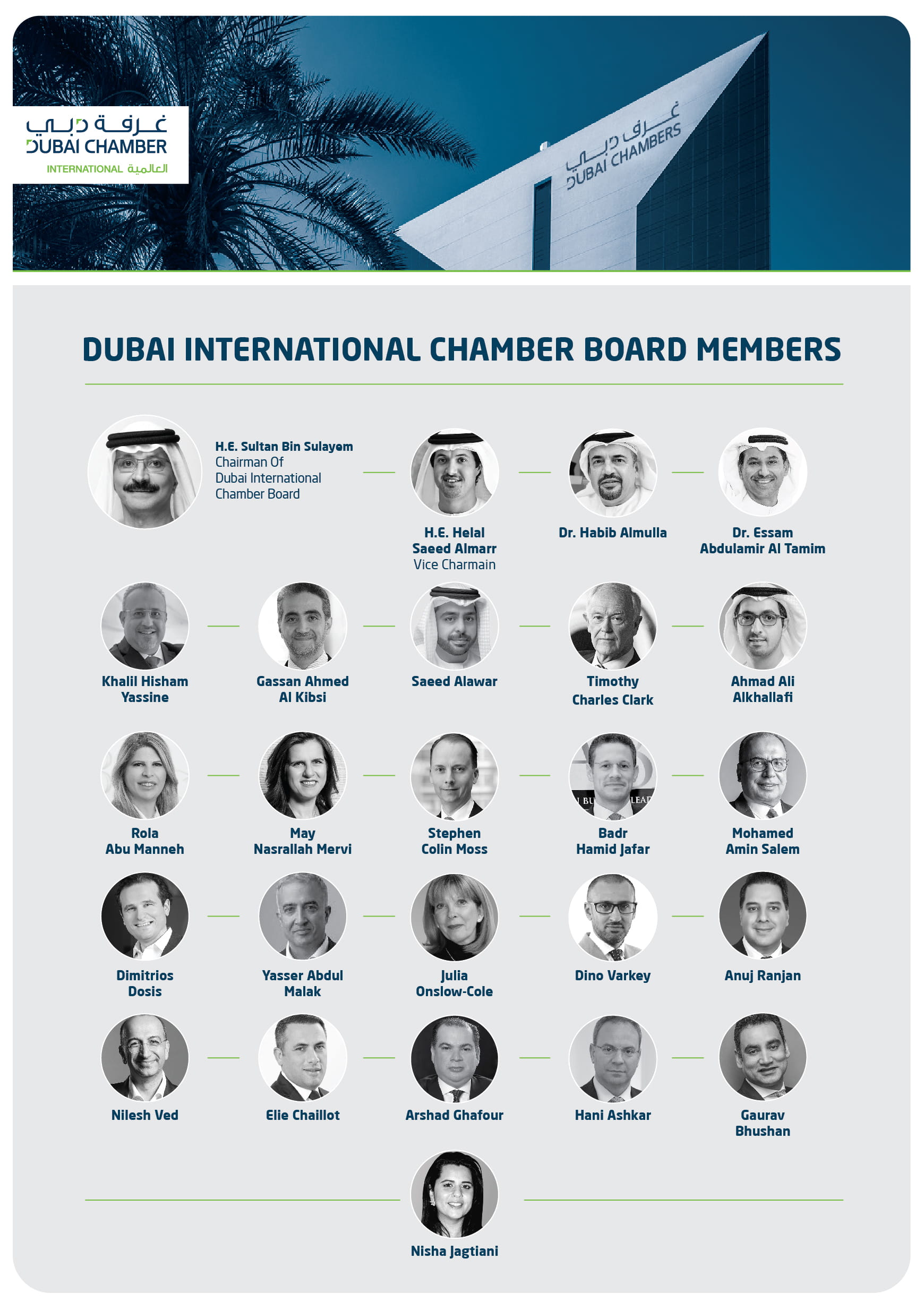 كما يضم مجلس إدارة غرف دبي في عضويته كلاً من: معالي هلال سعيد المري، وأحمد عبدالله بن بيات، وعمر عبدالله الفطيم، وشهاب محمد قرقاش، وخالد جمعة الماجد، وفيصل جمعة بلهول، وبطي سعيد الكندي، وعلي سعيد البواردي، وخالد أحمد الطاير، وأمل محمد المري، والدكتورة أمينة الرستماني، وغسان أحمد الكبسي، وطارق أحمد باقر.