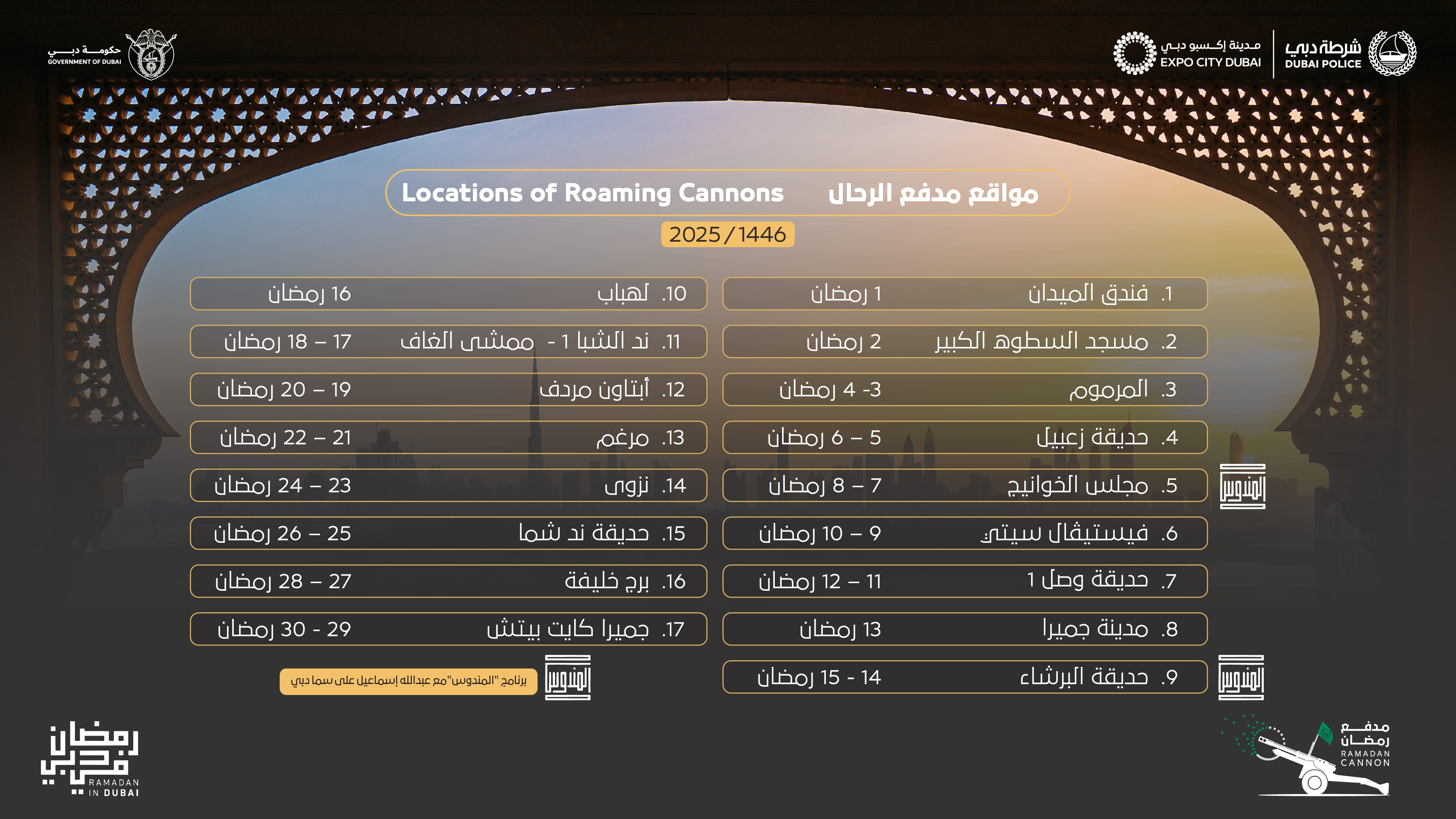 أعلنت القيادة العامة لشرطة دبي، خلال مؤتمر صحافي عقدته اليوم الإثنين، في مدينة إكسبو دبي، عن أماكن تواجد مدافعها خلال شهر رمضان المبارك، موضحة أن هناك 8 مدافع ثابتة ستكون موزعة في مختلف أرجاء دبي، في حين سيكون هناك مدفع "رّحال واحد" يتنقل طيلة الشهر الفضيل في 17 منطقة على مستوى الإمارة.