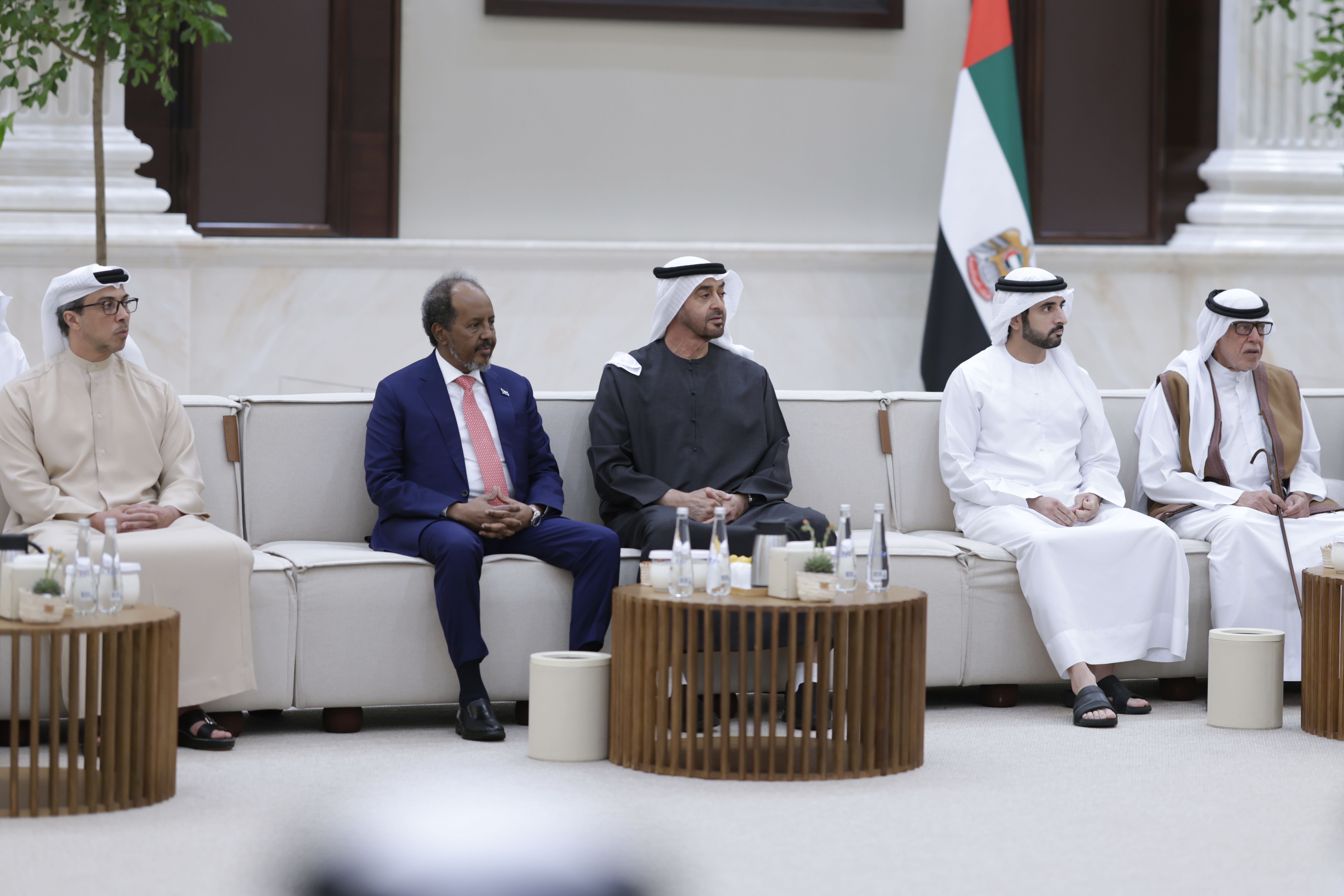 استقبل صاحب السمو الشيخ محمد بن زايد آل نهيان رئيس الدولة "حفظه الله"، اليوم فخامة حسن شيخ محمود، رئيس جمهورية الصومال الفيدرالية الذي يقوم بزيارة عمل إلى الدولة، بحضور سمو الشيخ منصور بن زايد آل نهيان، نائب رئيس الدولة نائب رئيس مجلس الوزراء رئيس ديوان الرئاسة وسمو الشيخ حمدان بن محمد بن راشد آل مكتوم، ولي عهد دبي نائب رئيس مجلس الوزراء وزير الدفاع.