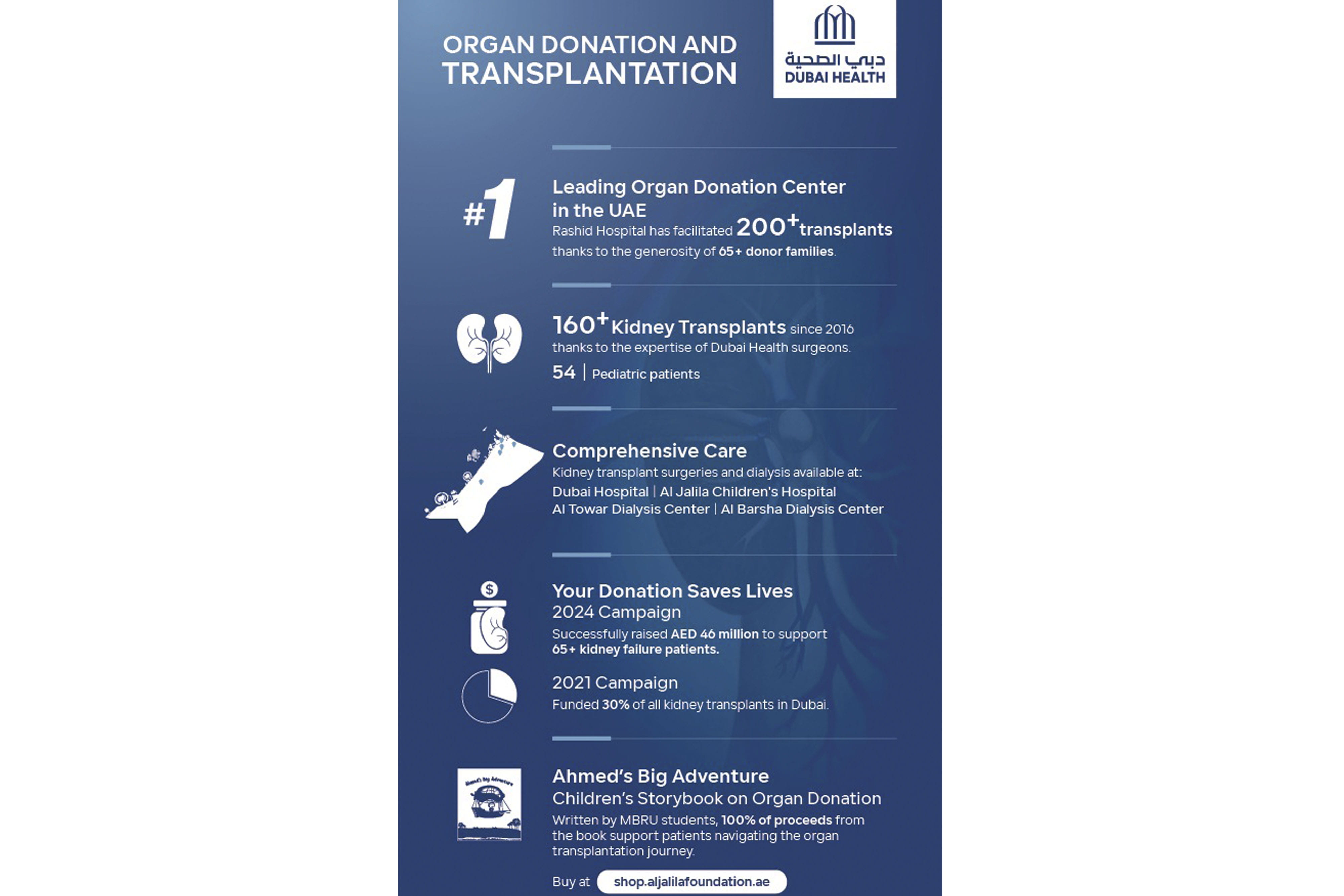 تحرص "دبي الصحية" على تقديم أعلى مستويات الرعاية الصحية ومنح الأمل للمرضى الذين يخضعون لعمليات زراعة الأعضاء. وفي هذا الإطار، أطلقت مؤسسة الجليلة ذراع العطاء لدبي الصحية النسخة الثانية من حملة "تبرعكم حياة" لجمع التبرعات لصالح عمليات زراعة الكلى، بهدف المساهمة في جمع تبرعات تتجاوز 46 مليون درهم إماراتي لإنقاذ حياة أكثر من 65 مريضاً يعانون من الفشل الكلوي، وذلك من خلال تغطية تكاليف العمليات الجراحية، وجلسات غسيل الكلى، والرعاية اللازمة في مرحلة ما بعد عملية الزراعة. ونجحت النسخة الأولى من الحملة، التي تم إطلاقها عام 2021، في تغطية رسوم عمليات زراعة الكلى لنحو 30% من إجمالي عمليات زراعة الكلى في دبي.
