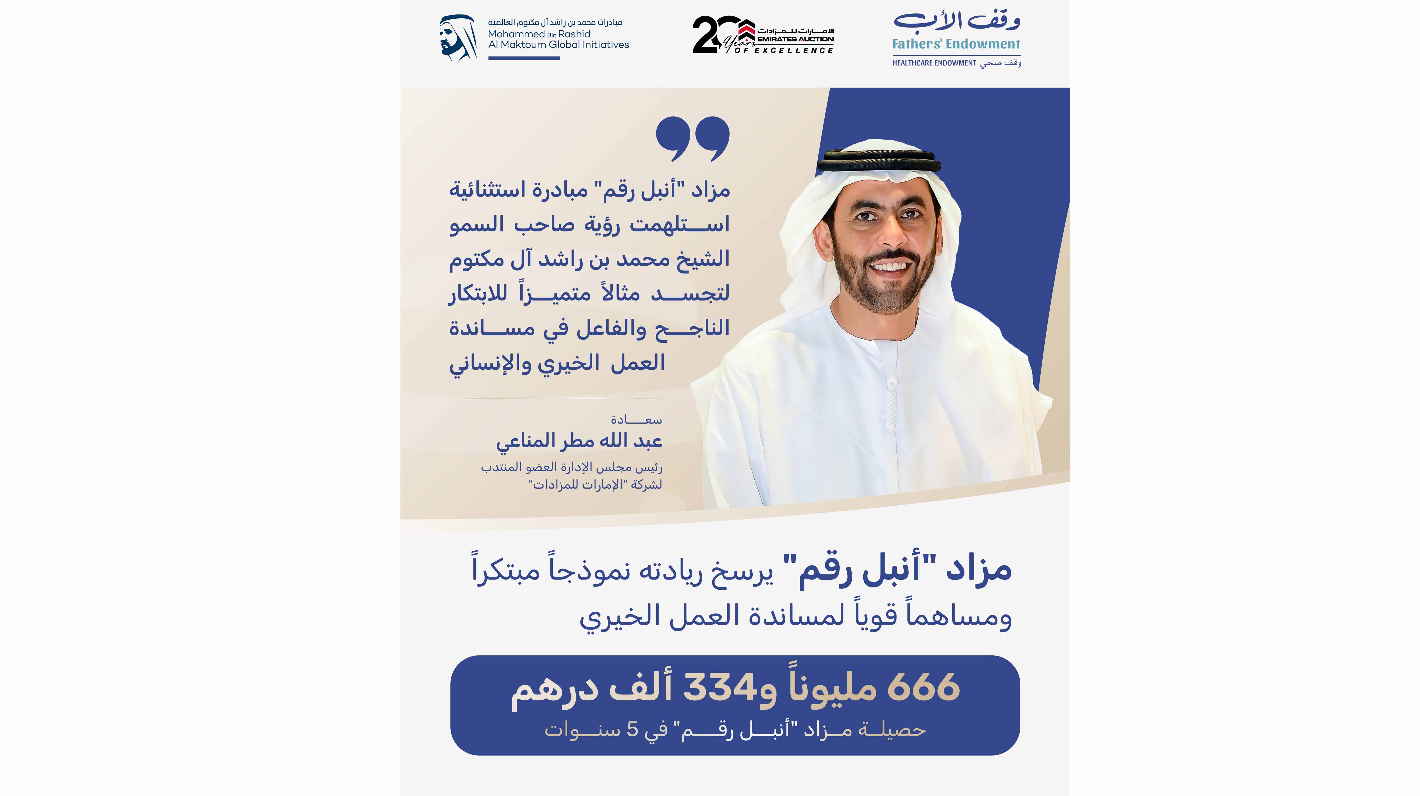 وجاء النجاح الكبير الذي حققته مزاد "أنبل رقم" الخيري الداعم لحملة "وقف الأب"، ليضيف صفحة جديدة في سجل هذه المبادرة الاستثنائية التي رسخت خلال أربع سنوات سابقة مكانة متفردة كمنصة مهمة تفتح أمام أصحاب الأيادي البيضاء أبواب التنافس على فعل الخير، وتسهم في ترسيخ ثقافة العطاء في المجتمع، وتعكس صورة متميزة عن مجتمع الإمارات الذي يتسابق في البذل والعطاء من أجل نشر الخير للجميع.