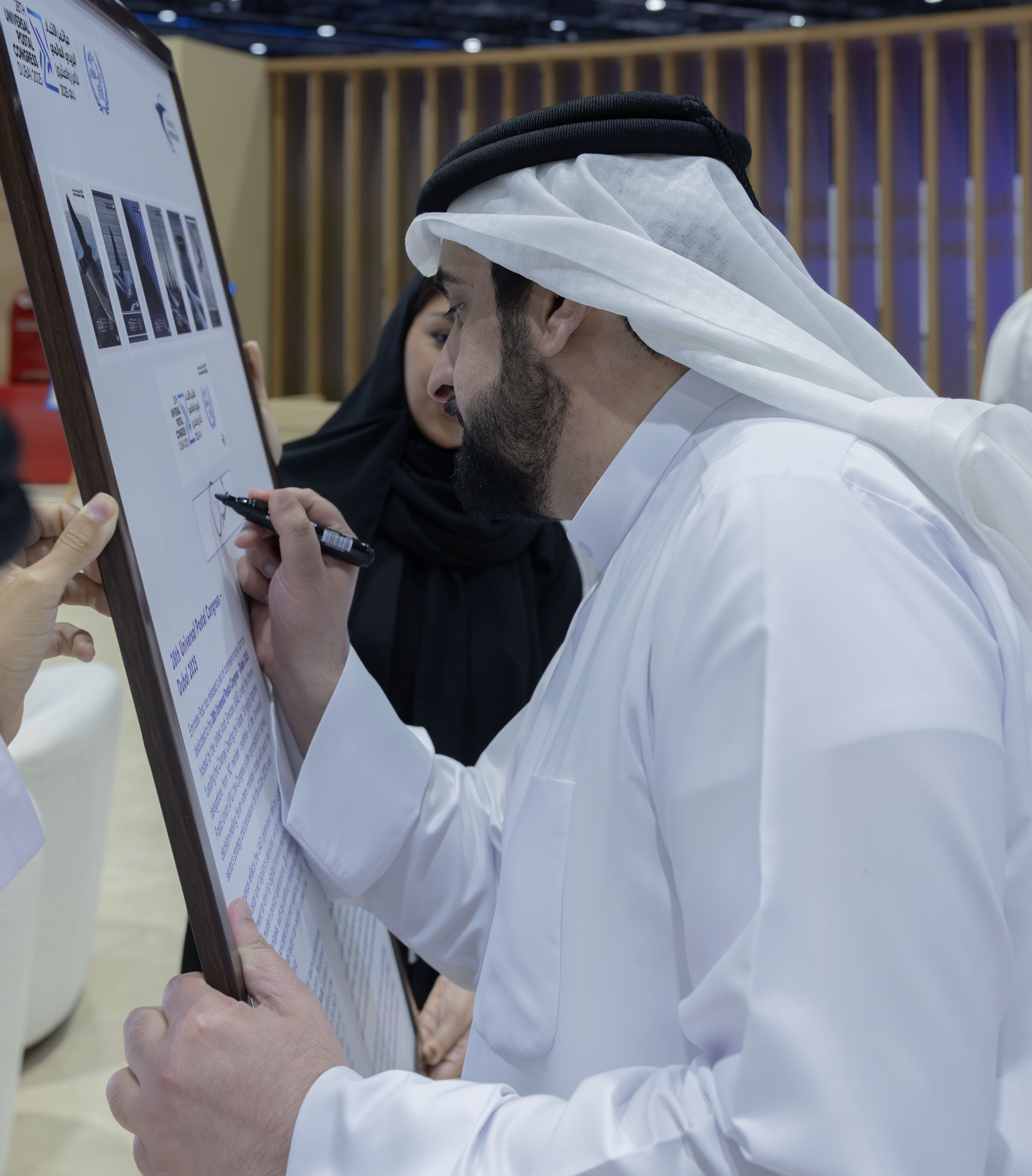وقام سموّ الشيخ أحمد بن محمد بن راشد آل مكتوم بالتوقيع على الإصدار الأول لمجموعة الطوابع الرسمية الصادرة احتفاءً باستضافة دولة الإمارات للمؤتمر، حيث جسّد هذا الإصدار مكانة الدولة كمركز عالمي رائد للخدمات البريدية واللوجستية، مؤكداً التزامها بترسيخ مقومات التحوّل الرقمي من خلال توظيف أحدث التقنيات وتمكين حلول التجارة الإلكترونية والخدمات الذكية.