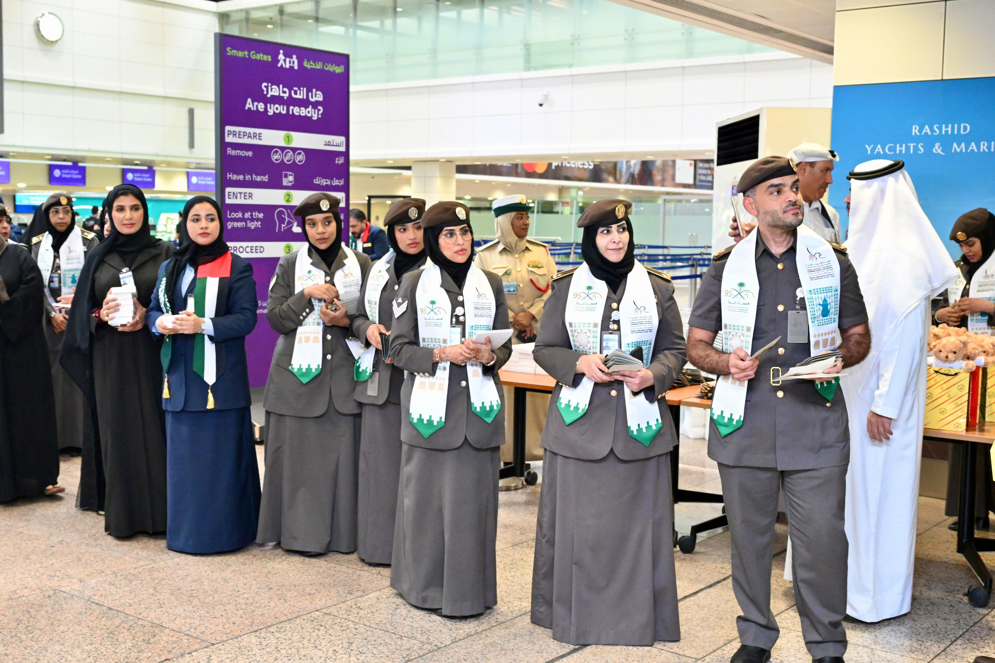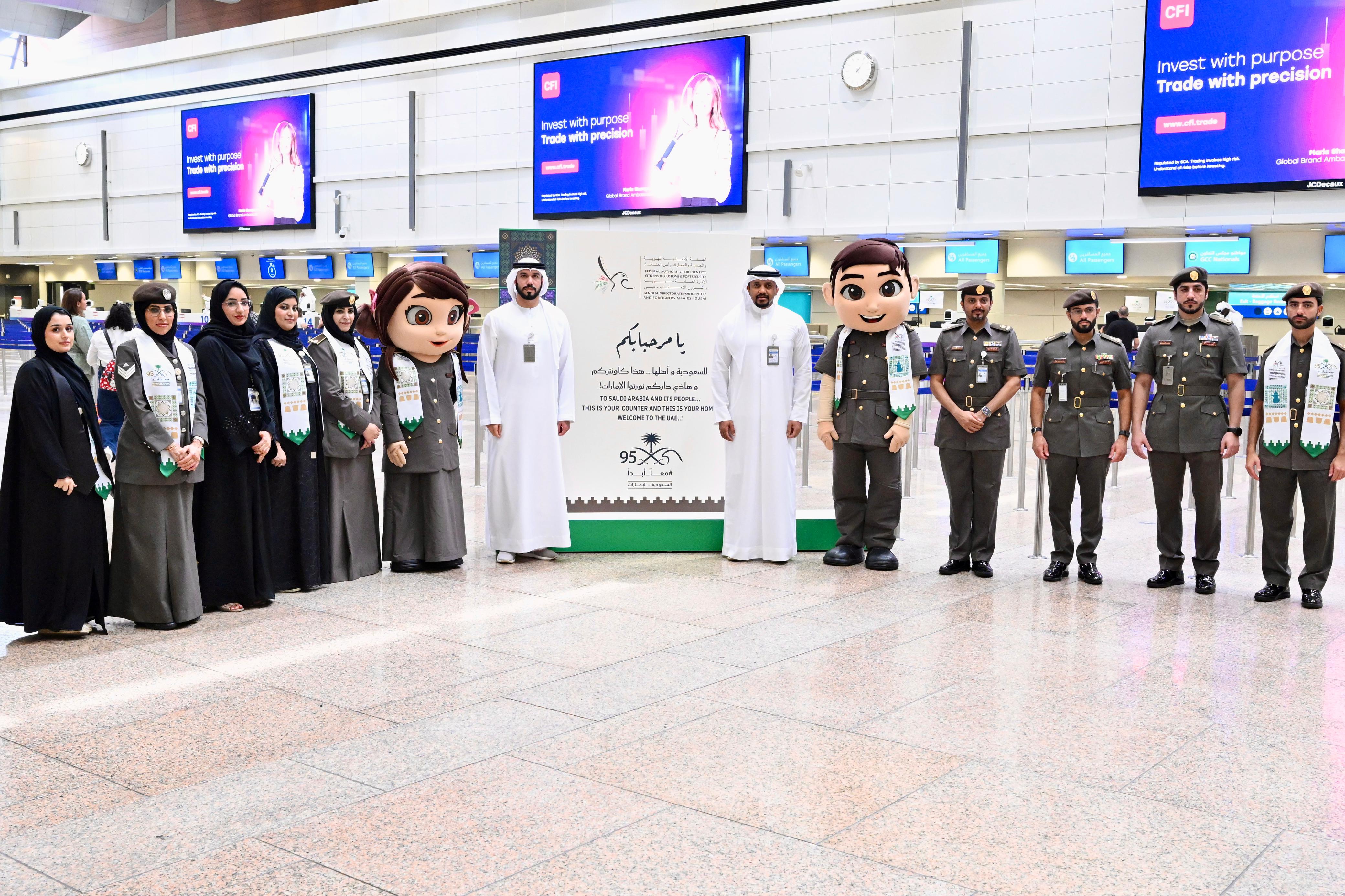 شهدت الاحتفالية أجواءً مميزة منذ لحظة وصول المسافرين القادمين من المملكة إلى مطار دبي، حيث استُقبلوا بالأعلام والهدايا التذكارية، تعبيرًا عن قيم الضيافة الإماراتية الأصيلة وتجسيداً للعلاقات المتينة التي تجمع الشعبين الشقيقين. كما أُضيئت البوابات الذكية باللون الأخضر، وتم تقديم هدايا للأطفال عبر الشخصيتين الكرتونيتين المحبوبتين "سالم وسلامة"، ليشكل ذكرى فريدة للمسافرين في هذه المناسبة الوطنية الغالية.