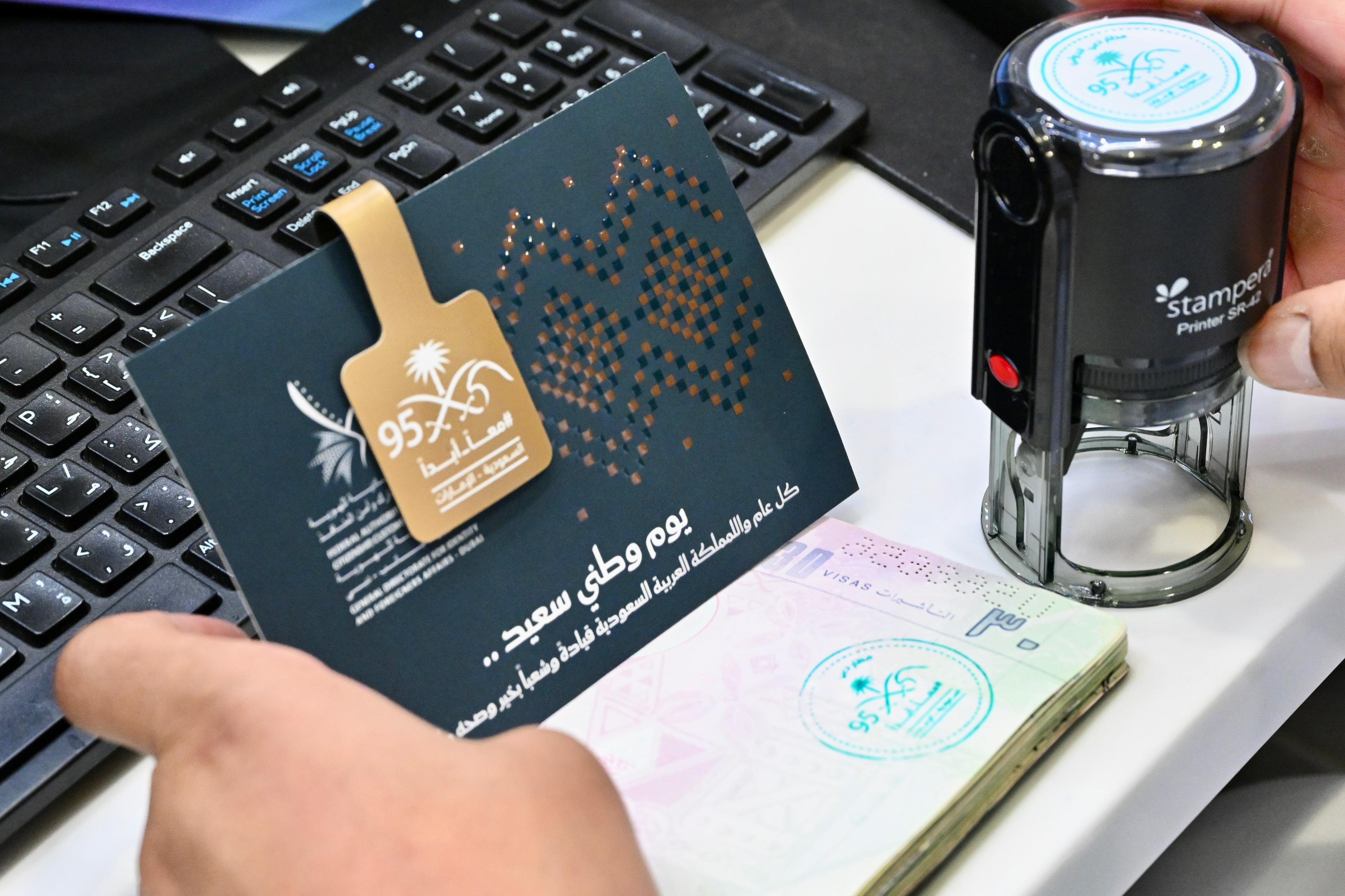 وفي بادرة رمزية للتقدير، زُيّنت جوازات سفر السعوديين بختم خاص يحمل شعار اليوم الوطني السعودي الـ95 وعبارة (الإمارات_السعودية_معاً_أبداً)، بما يعكس متانة العلاقات الاستراتيجية والتكامل بين البلدين.