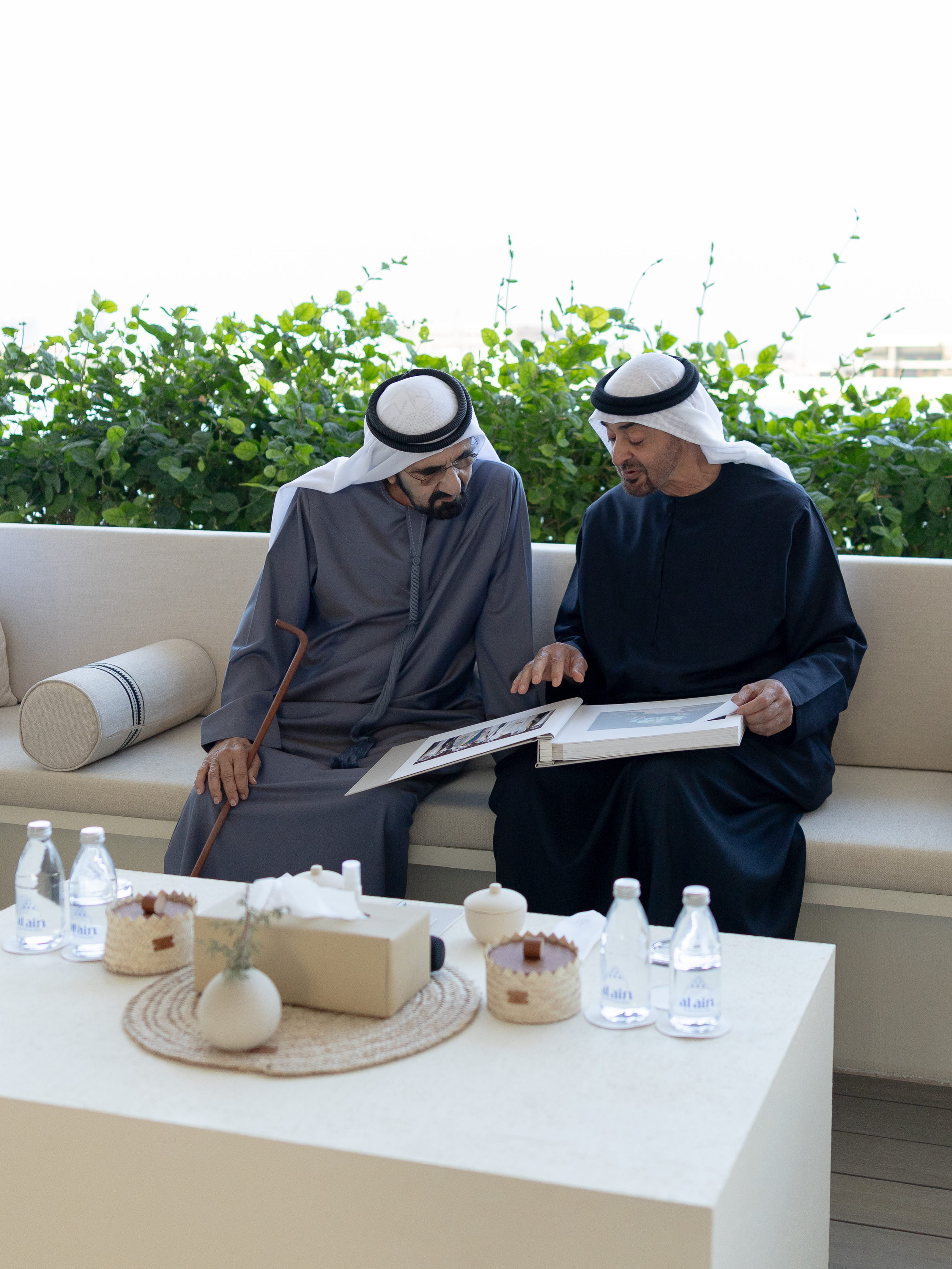 وأهدى صاحب السمو رئيس الدولة أخاه صاحب السمو محمد بن راشد آل مكتوم - خلال اللقاء الذي جرى في قصر البحر في أبوظبي - ألبوم صور يحمل توقيع سموه يوثق أبرز المحطات الوطنية والمناسبات التي جمعت سموهما في خدمة دولة الإمارات ومسيرة إنجازاتها..وذلك بمناسبة مرور عشرين عاماً على تولي سموه رئاسة الحكومة الاتحادية.