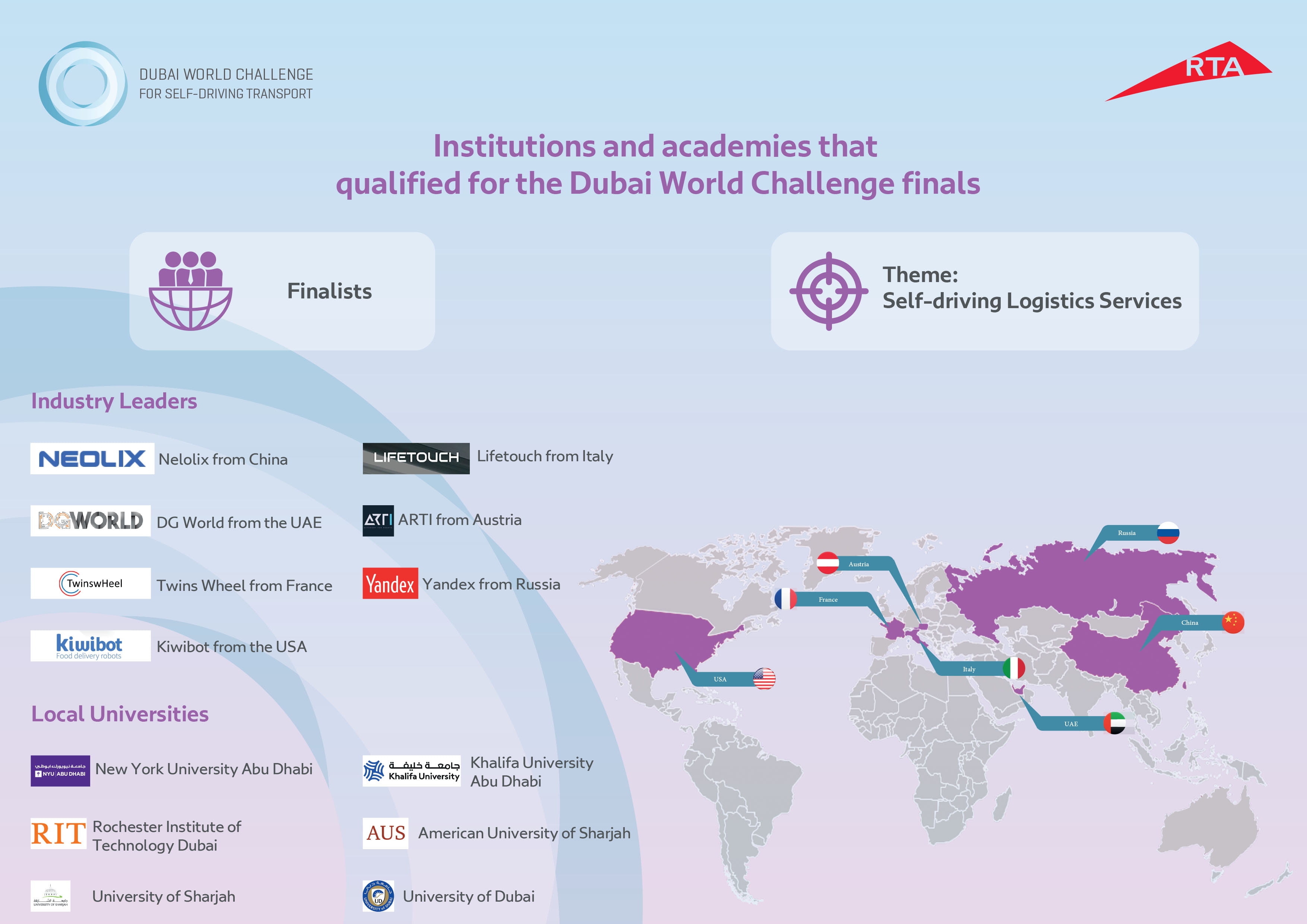 “Following the decision of the international judges panel chaired by Dr. Stephen Schladover- an international expert and Chair of the Judges Panel of the Dubai World Challenge for Self-Driving Transport, seven global companies have qualified for the final stage of the Challenge in the category of Leading Companies, namely: Neolix from China, Life Touch from Italy, and DG World from United Arab Emirates, Arti from Austria, Twins Wheel from France, Yandex from Russia, and Kiwi Bot from the United States of America,” revealed Al Tayer.