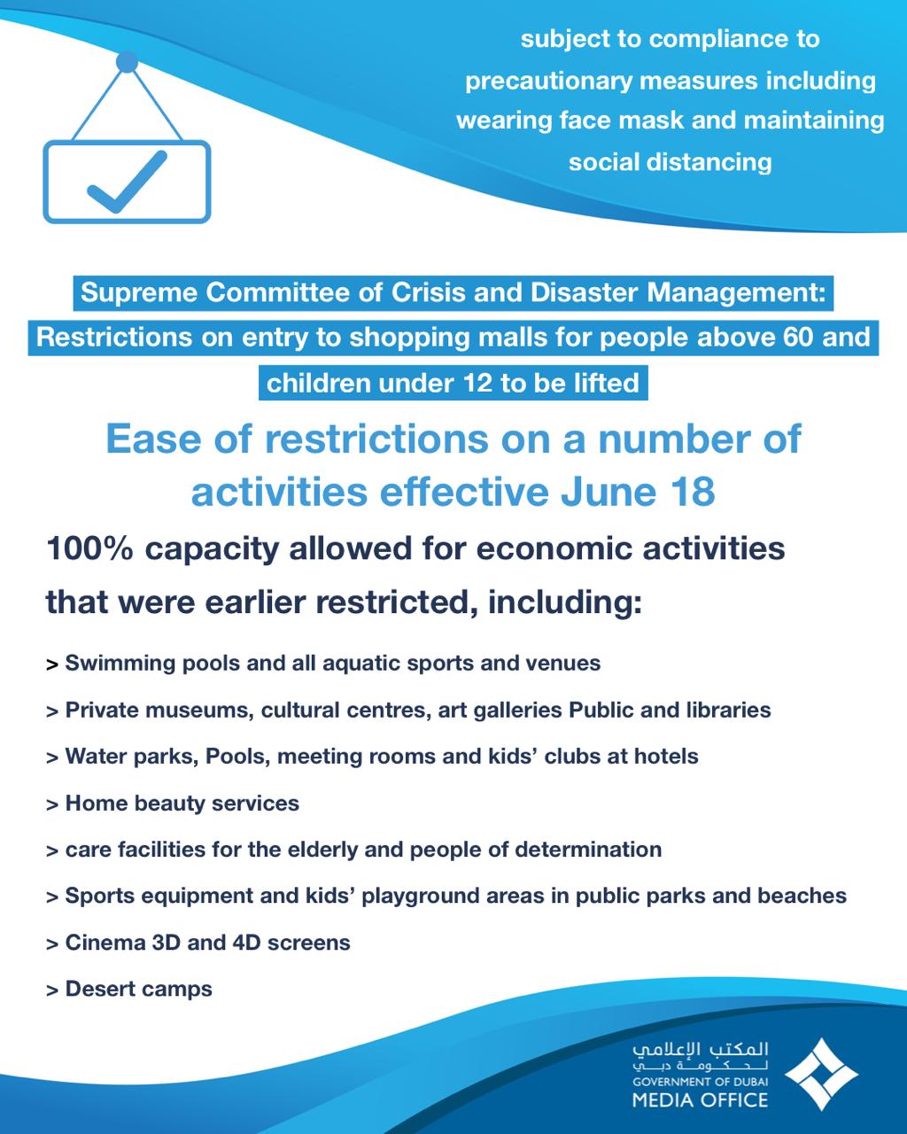 Under the directives of Vice President and Prime Minister of the UAE and Ruler of Dubai His Highness Sheikh Mohammed bin Rashid Al Maktoum, the Supreme Committee of Crisis and Disaster Management headed by His Highness Sheikh Mansour bin Mohammed bin Rashid Al Maktoum announced the resumption of a new set of economic activities and services in the emirate effective Thursday 18 June, 2020.